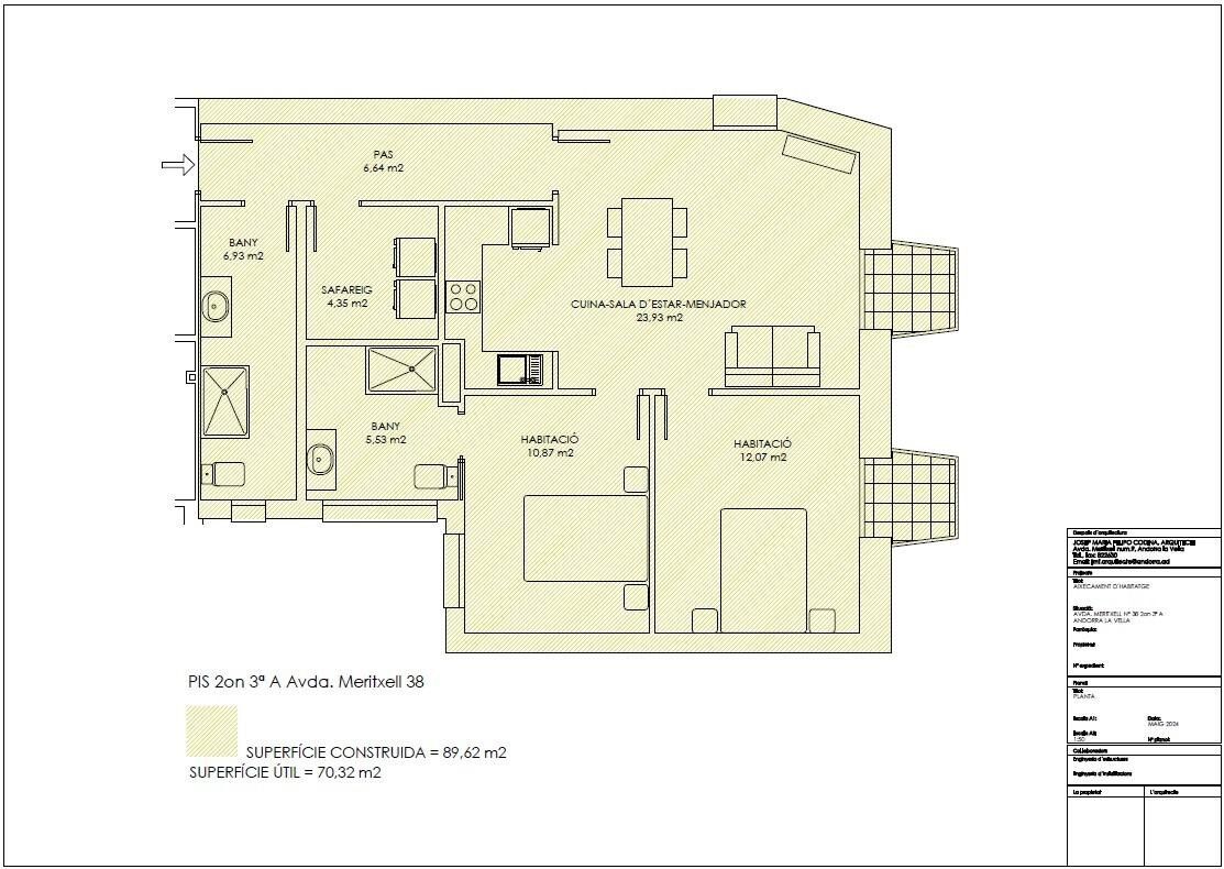 Exclusiva promoció d´obra nova situada a tan sols 500 metres del centre d´Andorra la Vella i del seu principal eix comercial.~L'edifici, de 14 plantes, té prevista la finalització per al desembre del 2027 i oferirà un entorn modern, còmode i funcional amb zones enjardinades i una pista de pàdel.~~Els habitatges es caracteritzen pel disseny contemporani, l'eficiència energètica tipus A i l'ús de materials de primera qualitat.~Totes tenen espai exterior amb pràctics balcons o terrasses, i una acurada orientació que garanteix llum natural i confort tèrmic durant tot l'any.~~Característiques principals~Estructura i façana: sistema de formigó prefabricat i façana ventilada amb revestiment ceràmic imitació formigó i fusta tecnològica, que aporta elegància i durabilitat.~Fusteria exterior: alumini o PVC amb trencament de pont tèrmic i triple vidre, garantint el millor aïllament tèrmic i acústic.~Climatització: sistema de terra radiant-refrescant amb producció d'ACS mitjançant xarxa FEDA Ecoterm, màxima eficiència i confort.~Domòtica: preinstal·lació domòtica escalable i cortines opaques motoritzades al saló.~Il·luminació LED a cuines, banys i zones comunes.~Preinstal·lació per a vehicle elèctric a places d'aparcament.~~Acabats interiors~Sòl estratificat SPC de Grat i gres porcellànic antilliscant a balcons i terrasses.~Cuines totalment equipades amb mobiliari MOBALPA o similar, taulell CERATOP o similar, i electrodomèstics SIEMENS o equivalent.~Banys amb mobiliari suspès, aixetes termostàtiques i plat de dutxa de resina amb mampara.~Porta dentrada blindada i portes interiors lacades.~~Sostenibilitat i eficiència~Gràcies al disseny constructiu, aïllament avançat i sistemes energètics d'última generació, la promoció obté la màxima qualificació energètica A, reduint el consum i l'impacte ambiental.~~Aquest immoble de 100 m2 és una primera planta amb un balcó de 18 m2 i en orientació Sud, de manera que té sol tot el dia.~Disposa de:~-Entrada amb armari.~-Saló menjador ampli, cuina equipada.~-Bany de cortesia.~-Safareig funcional.~-Bany complet~-2 habitacions àmplies amb armaris de paret.~-Suite principal amb armaris i bany complet~-Sortida al balcó des de qualsevol estada.~Possibilitat de compra de dues places daparcament i un traster.~~Immobiliària Gali a la vostra disposició #ref:04747/5210