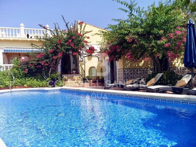 Descubre este acogedor chalet lleno de encanto, ubicado en una de las zonas más tranquilas y mejor conectadas de la ciudad. Perfecto para quienes buscan comodidad, seguridad y calidad de vida, este hogar ofrece una atmósfera cálida y un entorno ideal para disfrutar en familia. La propiedad se asienta sobre una parcela llana de 1.496 m², con orientación sur y múltiples zonas exteriores para disfrutar del clima mediterráneo. Distribución y espacios interiores La vivienda, muy cómoda y luminosa, cuenta con: 2 dormitorios (el principal con baño en-suite) 2 baños completos Amplio recibidor Salón grande y muy luminoso Comedor independiente Cocina equipada - abierta al comedor con despensa/lavandería Oficina, con posibilidad de convertirla en trastero, almacén o vestidor para la habitación principal Armarios empotrados en los dormitorios El dormitorio principal, el salón y la oficina disponen de aire acondicionado frío/calor. La casa está adaptada para personas con movilidad reducida. Zona exterior Una propiedad perfecta para quienes disfrutan de la vida al aire libre: Piscina completamente reformada en 2022, con bomba y filtro nuevos (2023) y focos LED (2024) Cocina de verano parcialmente abierta, equipada con horno de piedra para pizzas, barbacoa, encimera de gas y fregadero Amplia terraza cubierta con iluminación y electricidad, actualmente utilizada como zona de estar. Terraza con pérgola ideal para comidas y cenas al aire libre Zonas en el jardín que ofrecen diferentes ambientes exteriores. Jardín consolidado con amplias zonas verdes y árboles . Doble puerta de entrada para mayor privacidad Parking para 3-4 coches Servicios cercanos: supermercados, centro comercial , lavandería, zona de ocio con bares y restaurantes, centro médico, hospital, farmacia, correos y colegios. Cerca a playas y calas. La propiedad destaca por su luminosidad, amplios espacios interiores y una distribución funcional que invita a relajarse y desconectar. Su entorno residencial asegura paz y privacidad, sin renunciar a la cercanía de servicios, comercios y áreas verdes. Un lugar donde cada día se vive con calma y confort. #ref:CBSA754