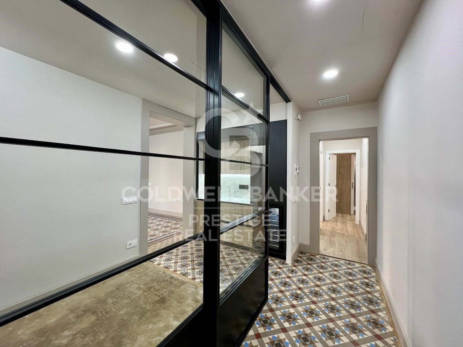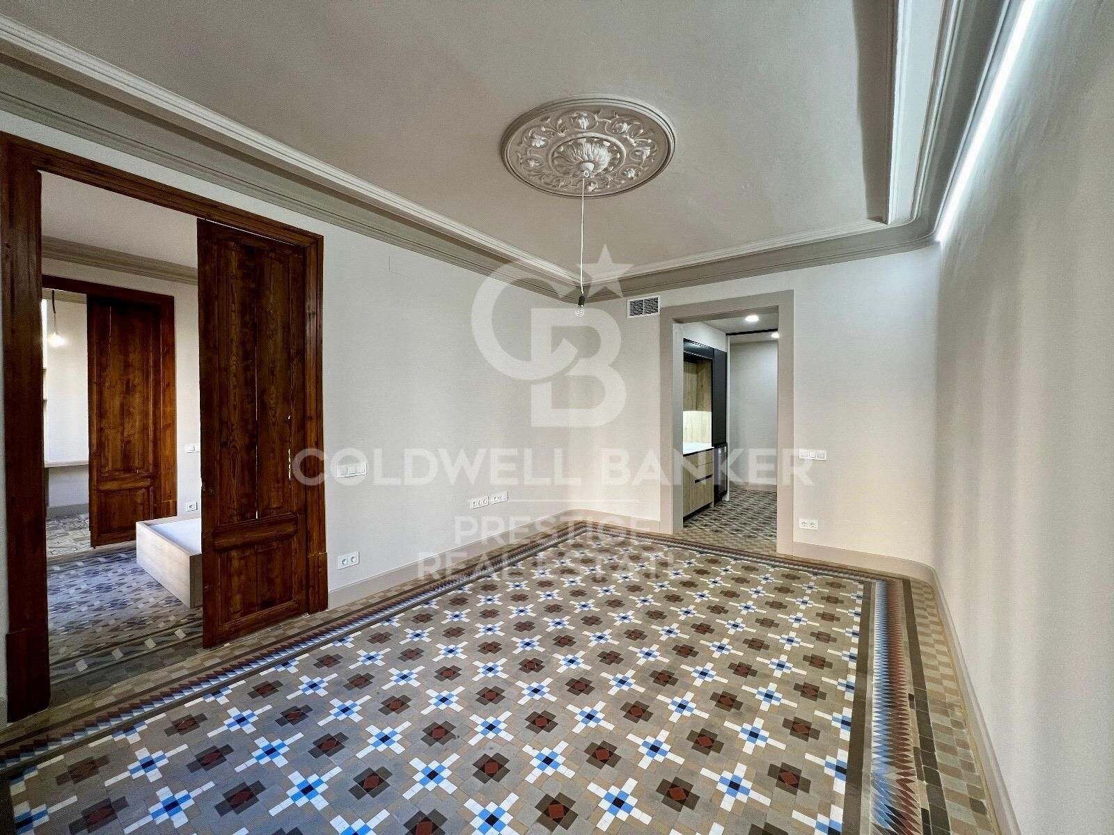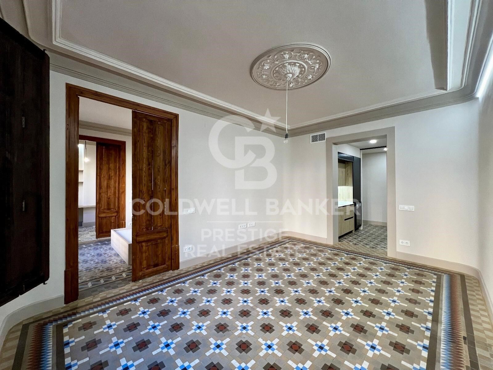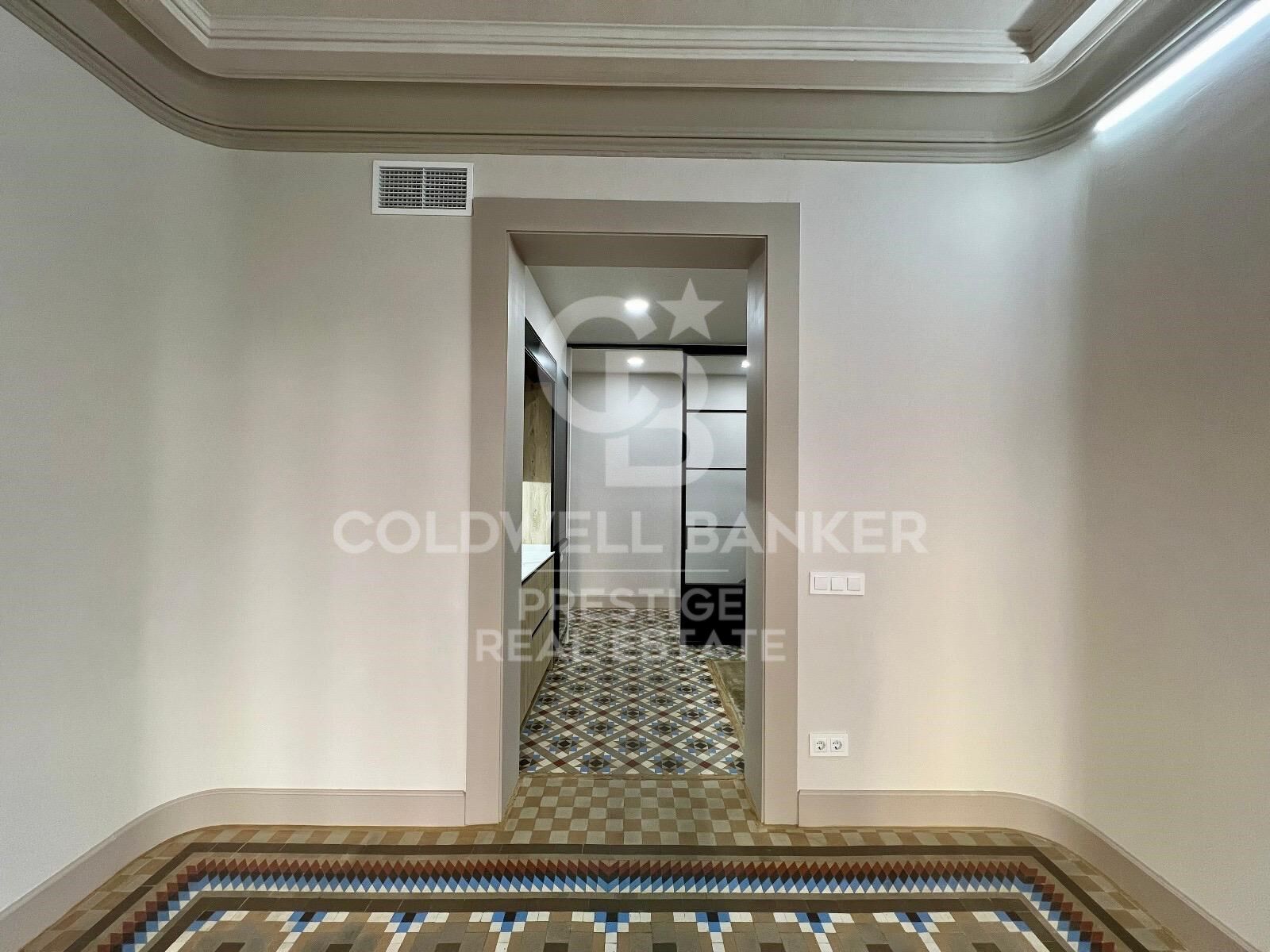 Descubre un hogar con carácter propio en plena Gran Vía, donde la historia y la modernidad conviven en perfecta armonía. Ubicado en una quinta planta, este piso ha sido renovado con gusto y funcionalidad, manteniendo la esencia arquitectónica original del edificio. Desde el primer momento, destacan los techos altos de 3,7 metros, que amplifican la luz natural y aportan una sensación única de amplitud. El pavimento de mosaico hidráulico, cuidadosamente preservado, añade un toque artístico y aporta personalidad a cada estancia. La reforma integral combina materiales contemporáneos con elementos clásicos, logrando un equilibrio entre estética y confort. La vivienda disfruta de doble orientación, lo que garantiza luminosidad constante y una ventilación cruzada excepcional. Las estancias principales se asoman a la Gran Vía, permitiéndote sentir la energía del centro urbano desde una perspectiva privilegiada. En contraste, el extremo posterior de la vivienda ofrece un refugio de calma: una práctica terraza cubierta que se convierte en un espacio ideal para desconectar, leer o disfrutar de un momento al aire libre sin renunciar a la privacidad, un verdadero lujo en esta zona tan solicitada de la ciudad. Cada elemento del piso ha sido pensado para aportar bienestar y practicidad en el día a día. Tanto si te gusta compartir momentos con invitados bajo sus imponentes techos como si prefieres relajarte en tu terraza, esta vivienda te ofrece luz, comodidad y carácter en una de las ubicaciones más emblemáticas de Barcelona. Para más información o para concertar una visita, no dudes en ponerte en contacto con nosotros. #ref:CBES2747 (2)
