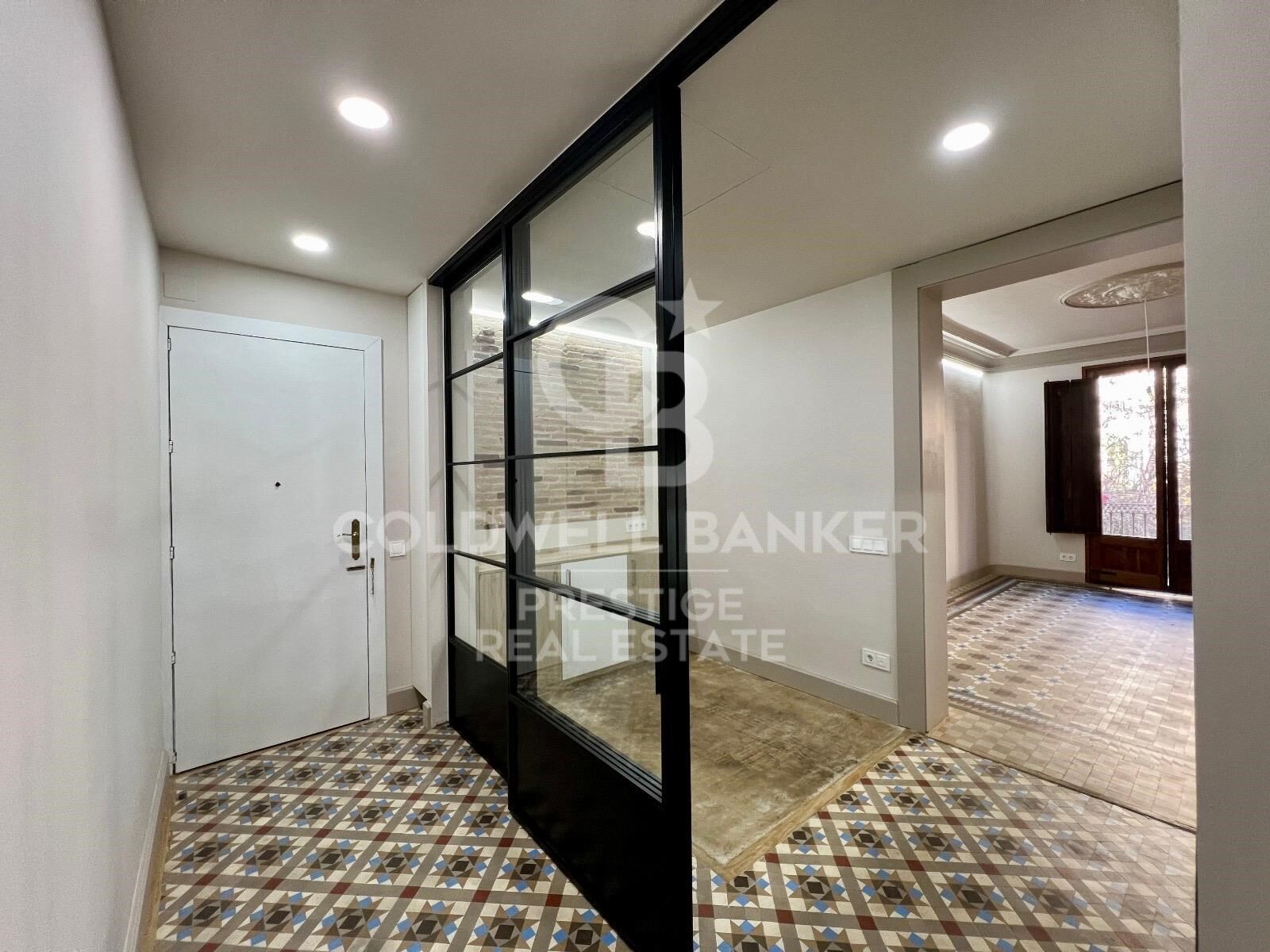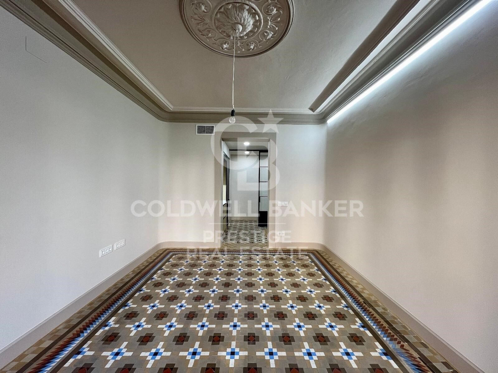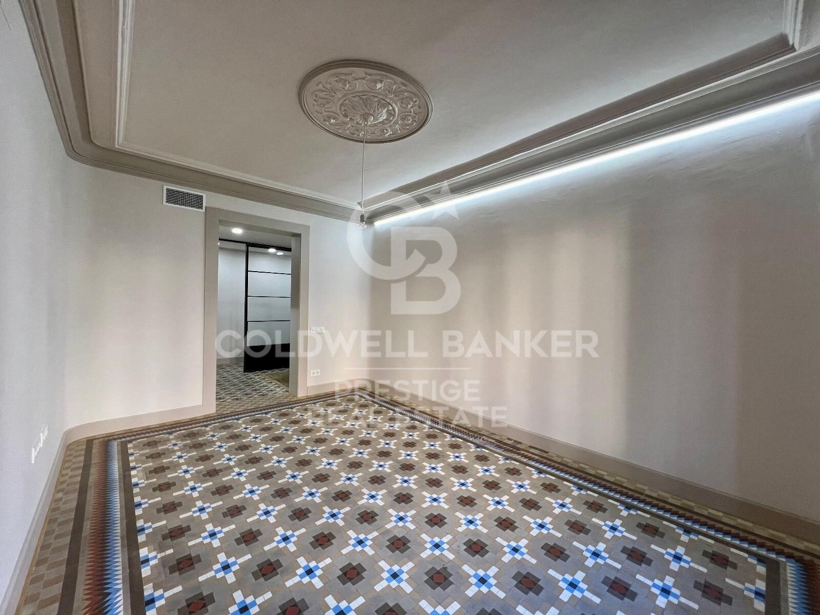 Descubre un hogar con carácter propio en plena Gran Vía, donde la historia y la modernidad conviven en perfecta armonía. Ubicado en una quinta planta, este piso ha sido renovado con gusto y funcionalidad, manteniendo la esencia arquitectónica original del edificio. Desde el primer momento, destacan los techos altos de 3,7 metros, que amplifican la luz natural y aportan una sensación única de amplitud. El pavimento de mosaico hidráulico, cuidadosamente preservado, añade un toque artístico y aporta personalidad a cada estancia. La reforma integral combina materiales contemporáneos con elementos clásicos, logrando un equilibrio entre estética y confort. La vivienda disfruta de doble orientación, lo que garantiza luminosidad constante y una ventilación cruzada excepcional. Las estancias principales se asoman a la Gran Vía, permitiéndote sentir la energía del centro urbano desde una perspectiva privilegiada. En contraste, el extremo posterior de la vivienda ofrece un refugio de calma: una práctica terraza cubierta que se convierte en un espacio ideal para desconectar, leer o disfrutar de un momento al aire libre sin renunciar a la privacidad, un verdadero lujo en esta zona tan solicitada de la ciudad. Cada elemento del piso ha sido pensado para aportar bienestar y practicidad en el día a día. Tanto si te gusta compartir momentos con invitados bajo sus imponentes techos como si prefieres relajarte en tu terraza, esta vivienda te ofrece luz, comodidad y carácter en una de las ubicaciones más emblemáticas de Barcelona. Para más información o para concertar una visita, no dudes en ponerte en contacto con nosotros. #ref:CBES2747 (2)