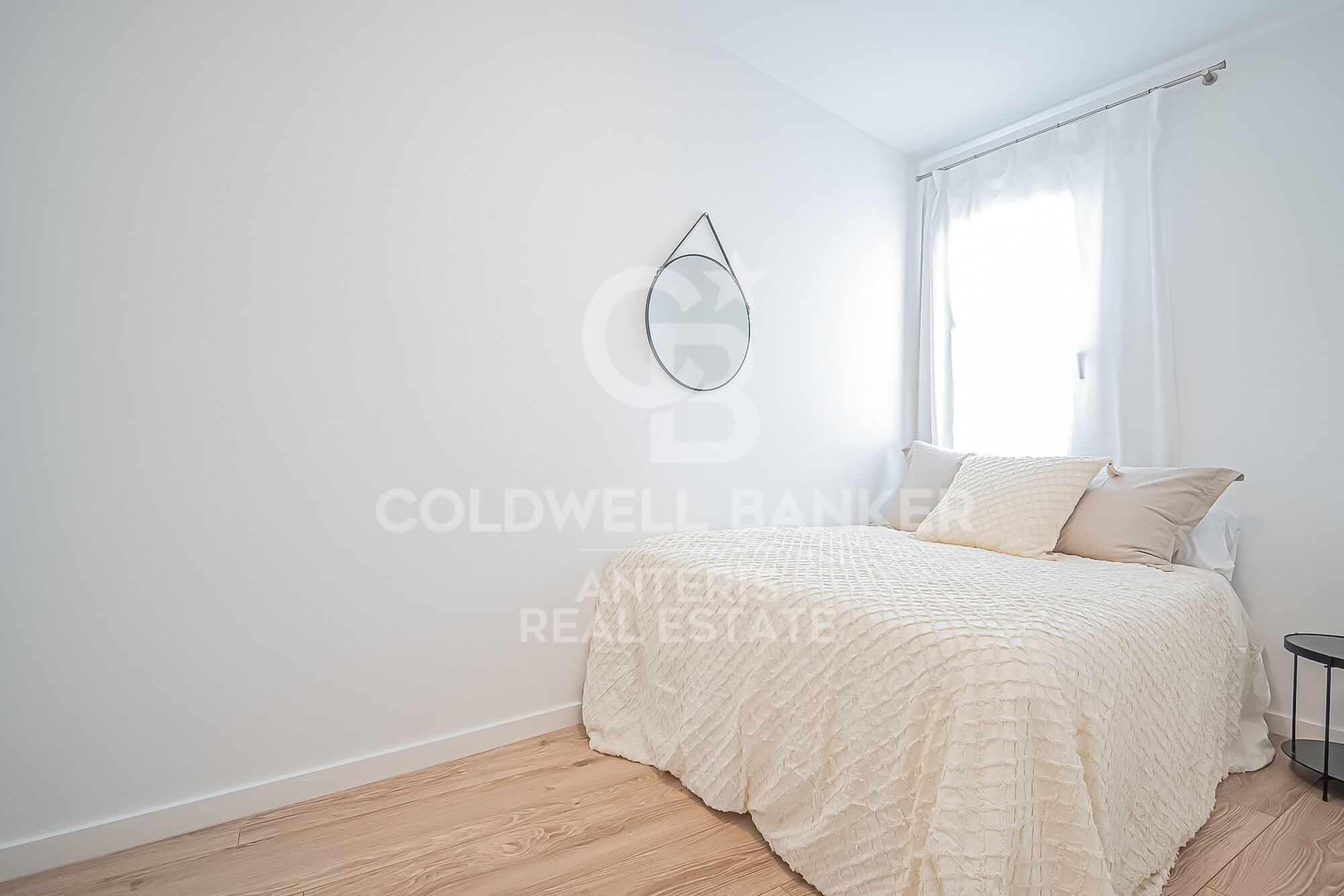 La vivienda cuenta con un gran salón-comedor y cocina con isla en concepto abierto, dos grandes ventanales que dan acceso a dos balcones dejan entrar abundante luz natural. Destacan los suelos de mosaico originales, los techos altos con volta catalana vista y su cocina de diseño equpada con electrodomésticos Bosch.