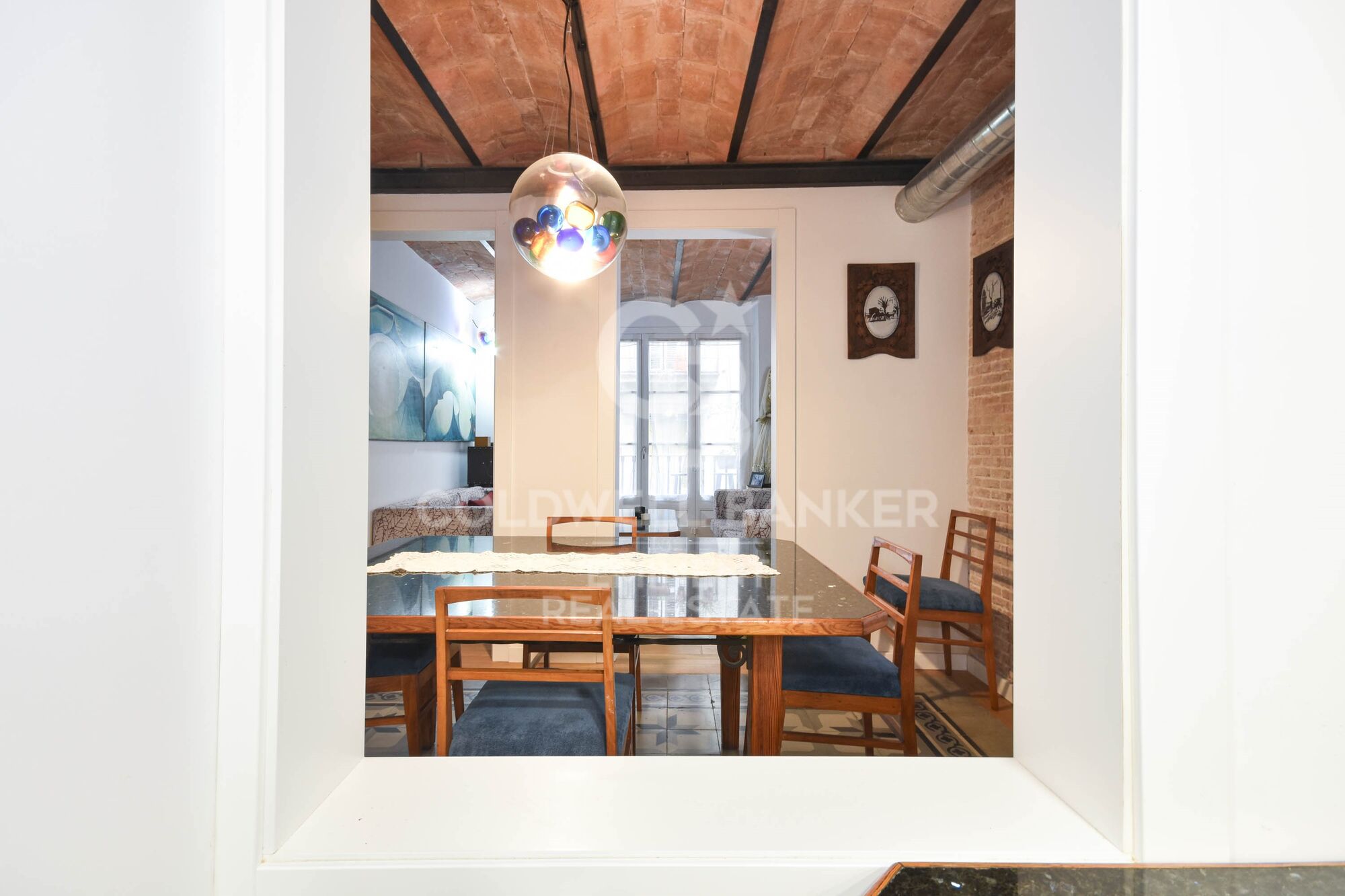 Comedor amplio conectado a una luminosa sala de estar con grandes ventanales que ofrecen vistas encantadoras a las vibrantes calles del Barrio Gótico.