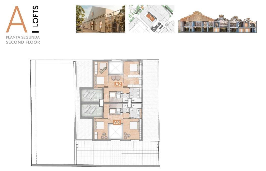 La nave D es la construcción más cercana al concepto de loft americano por sus grandes alturas, ventanales a lo largo de toda la fachada y esa presencia de luz tamizada. El proyecto presenta dos lofts en planta baja y en la segunda planta un loft y un dúplex con gran terraza.