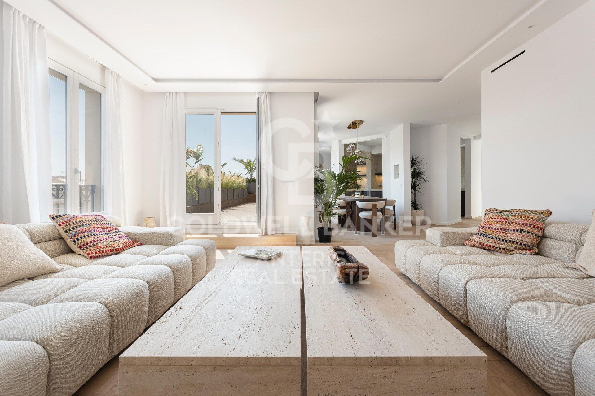 La zona de día se compone de un amplio salón-comedor con grandes ventanales y acceso directo a la terraza, así como una cocina integrada de diseño italiano, equipada con electrodomésticos de alta gama y espacio adicional de almacenaje.