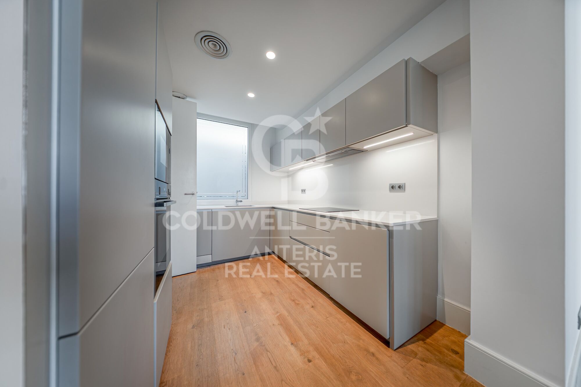 La cocina está totalmente equipada, se integra de forma funcional y elegante en el espacio de día. El salón-comedor cuenta con tres balcones que llenan de luz natural el ambiente