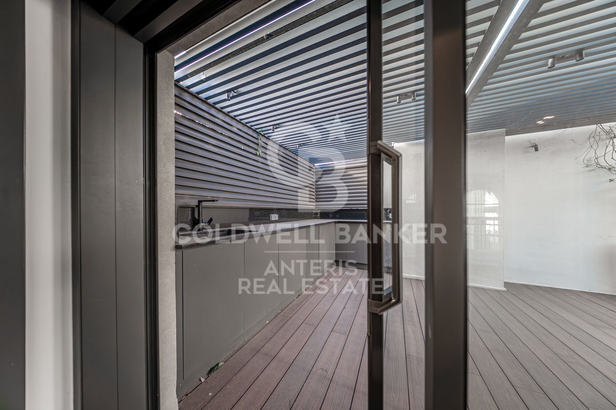 En la planta superior se encuentra el dormitorio principal y el acceso a una espectacular terraza-solárium privada, perfecta para relajarse, tomar el sol. Este espacio exterior está además equipado con una pequeña cocina, pensada para disfrutar al máximo de su uso.