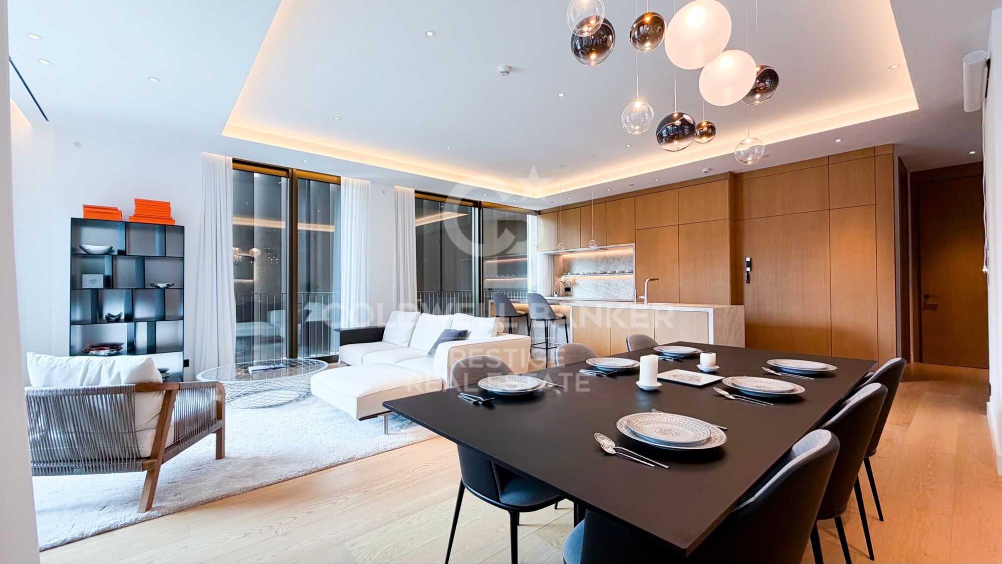 El increíble apartamento consta de un amplio salón a dos fachadas con logia, una cocina abierta totalmente equipada con electrodomésticos de alta calidad, dos dormitorios con baño en suite y un aseo de cortesía independiente.