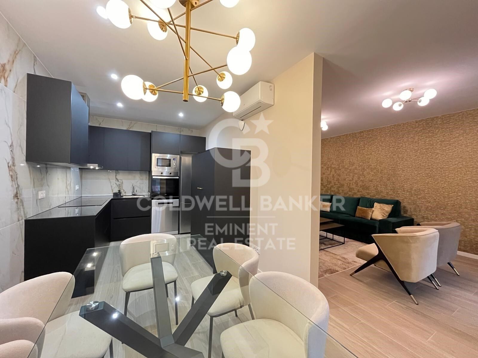 El piso, de doble orientación, ha sido cuidadosamente diseñado para separar la zona social de la zona privada. En la parte de día encontramos un luminoso salón-comedor integrado con una cocina de concepto abierto, equipada y con acceso a una encantadora galería típica del Eixample.