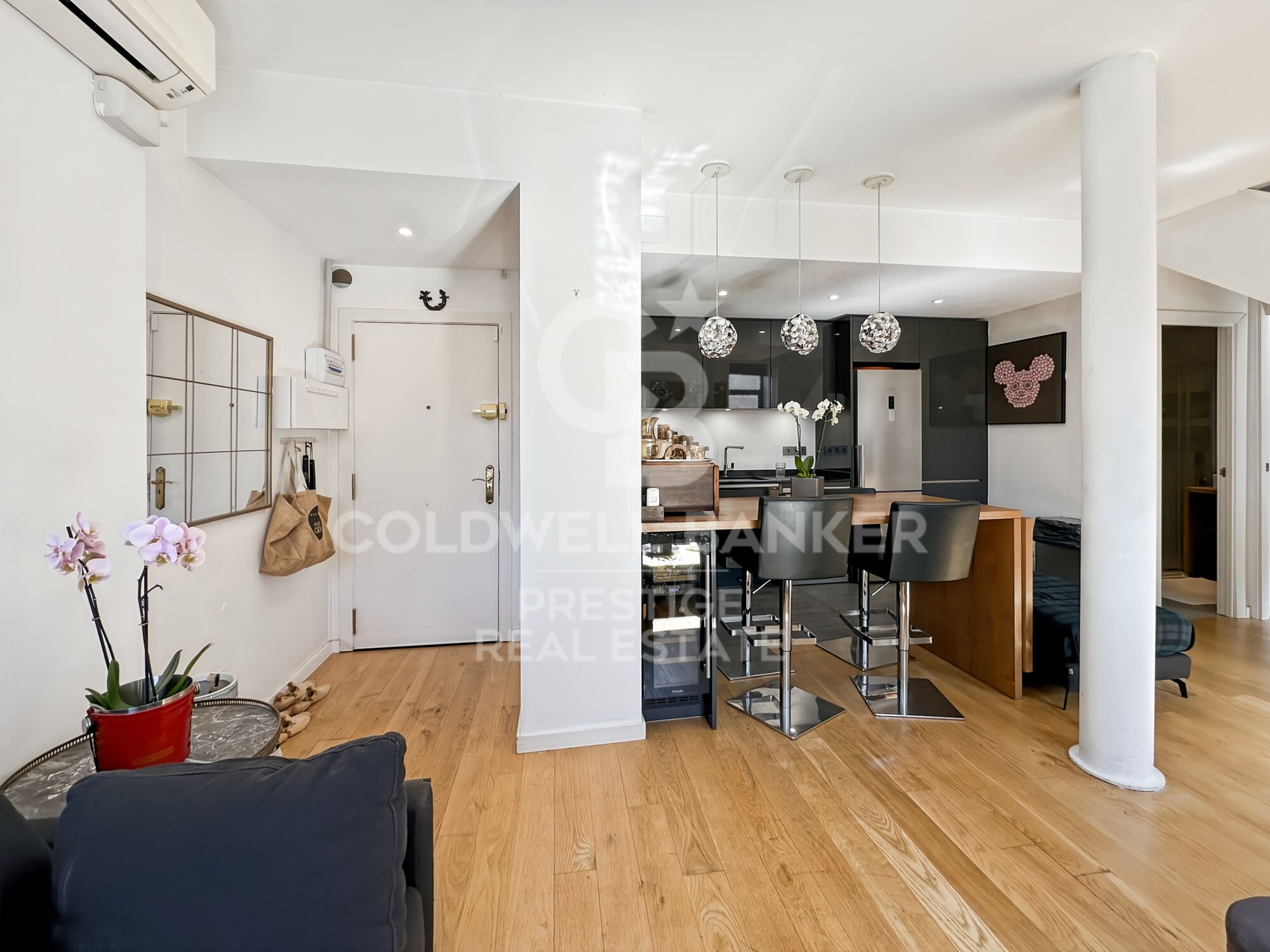 Cuenta con aire acondicionado frío-calor en todas las estancias, carpintería de aluminio con doble ventana, suelos de parqué natural de roble combinados con baldosas y una cocina completamente equipada con electrodomésticos.