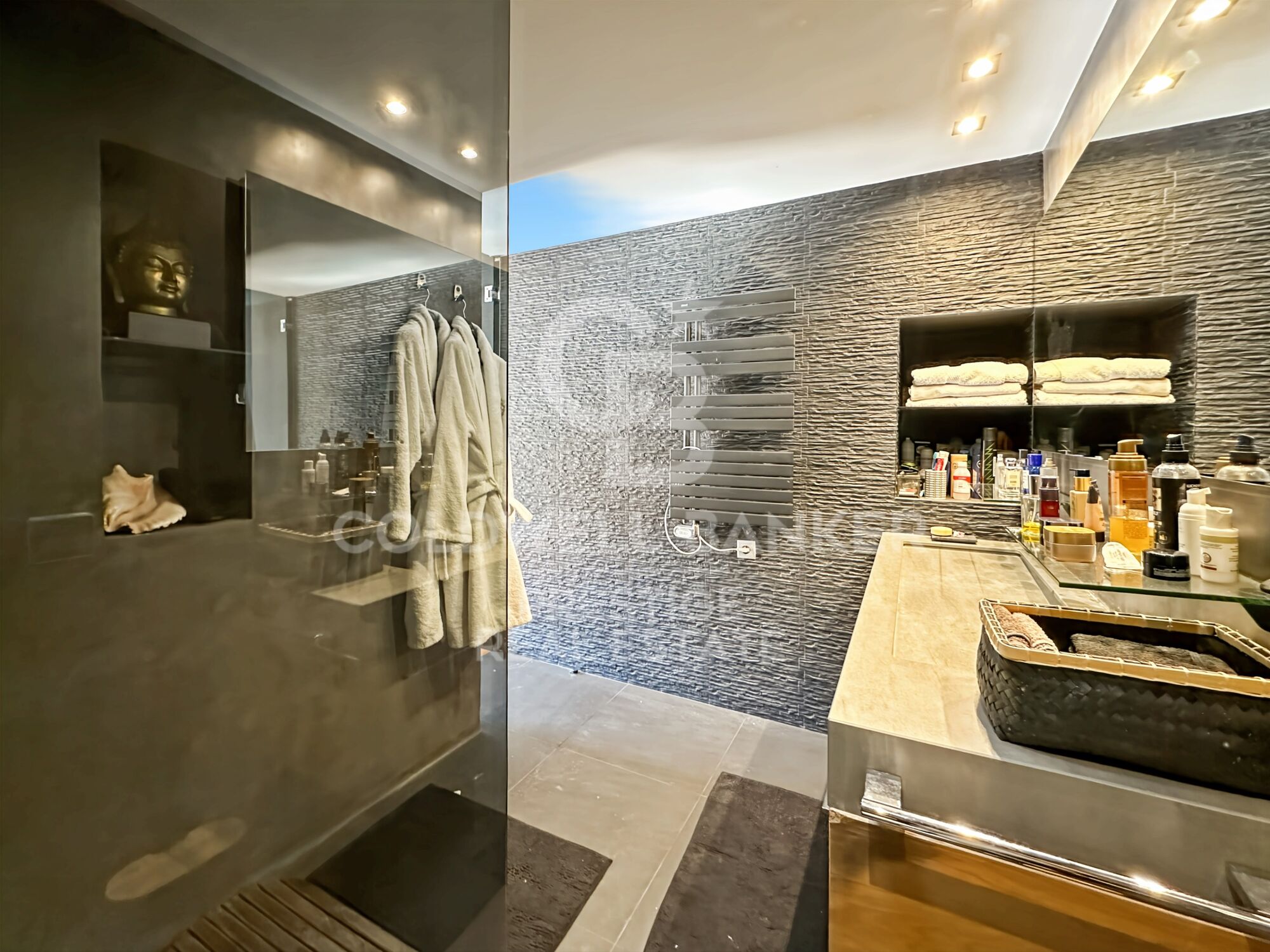 Subiendo por una cómoda escalera, accedemos a la planta superior, donde se abre un versátil espacio de despacho, una segunda habitación doble en suite y una encantadora terraza privada de 7 m² que conecta con la joya de la vivienda.