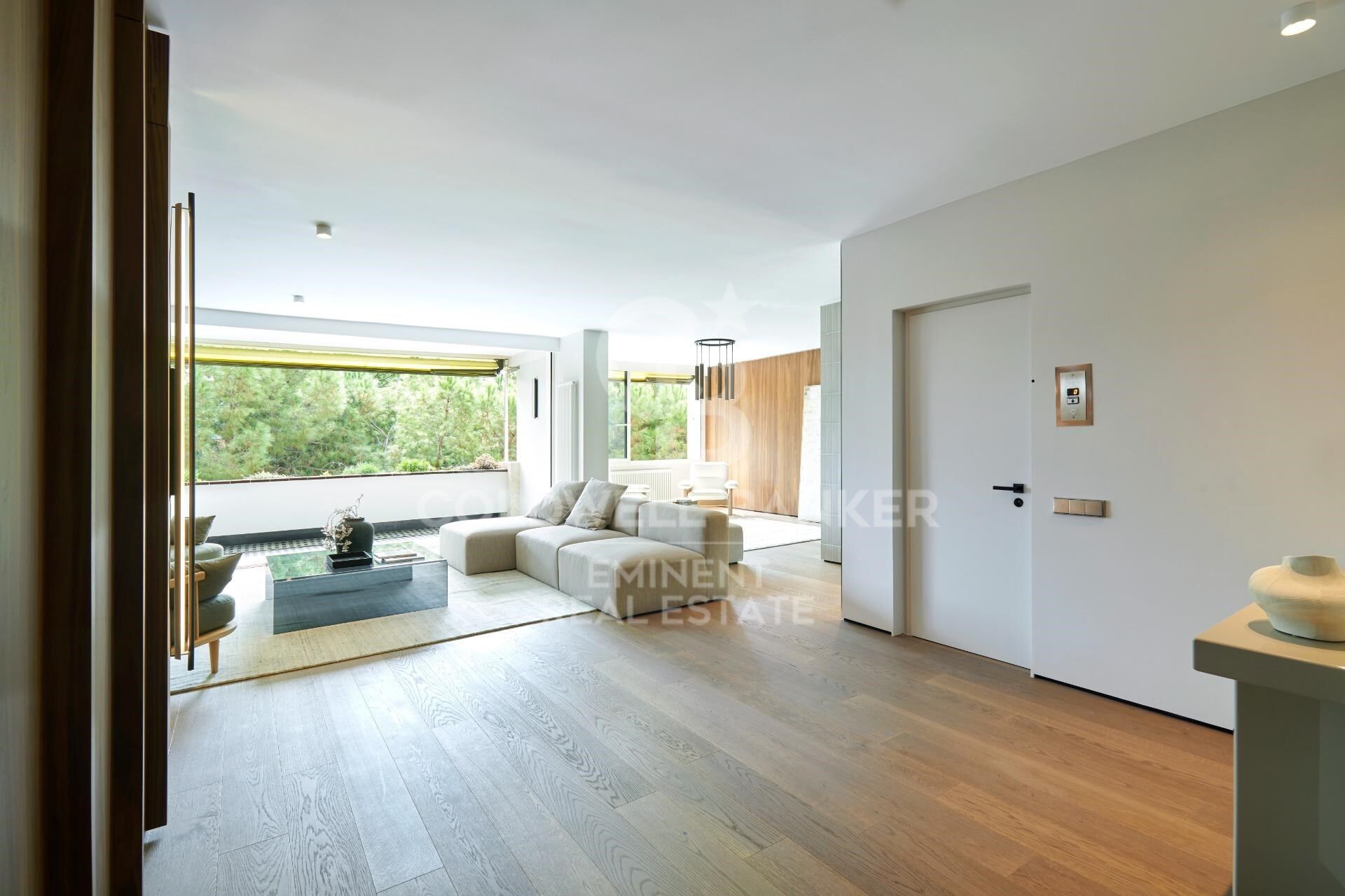El salón con acceso directo a una terraza privada con vistas despejadas a zonas verdes crea un ambiente acogedor y tranquilo.
