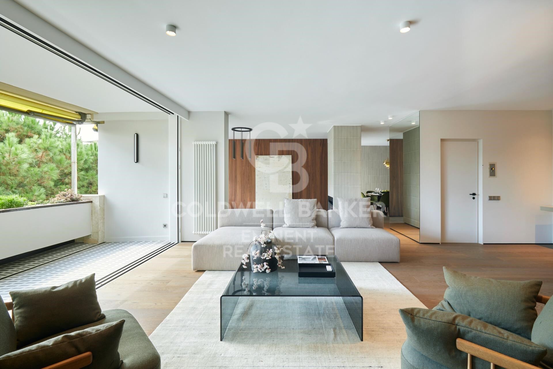 El salón con acceso directo a una terraza privada con vistas despejadas a zonas verdes crea un ambiente acogedor y tranquilo.