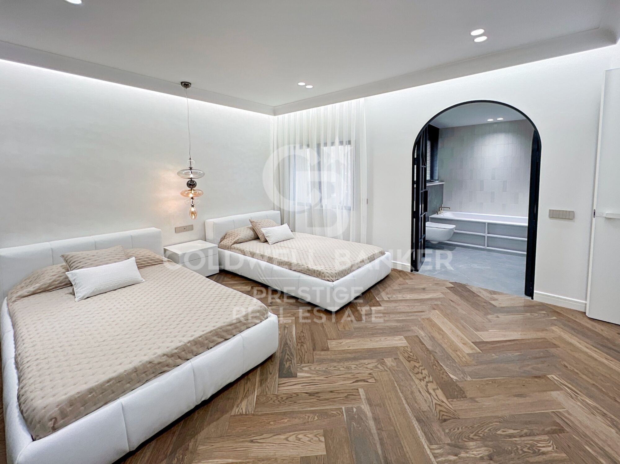 A través de un generoso distribuidor, accedes a la zona de descanso, donde cada habitación, todas en suite, te brinda un oasis de tranquilidad. La suite principal se abre a la terraza, mientras que los baños, espaciosos y elegantes, están equipados con ducha y bañera. Las otras tres habitaciones dobles ofrecen armarios empotrados y están meticulosamente diseñadas con materiales de alta calidad.