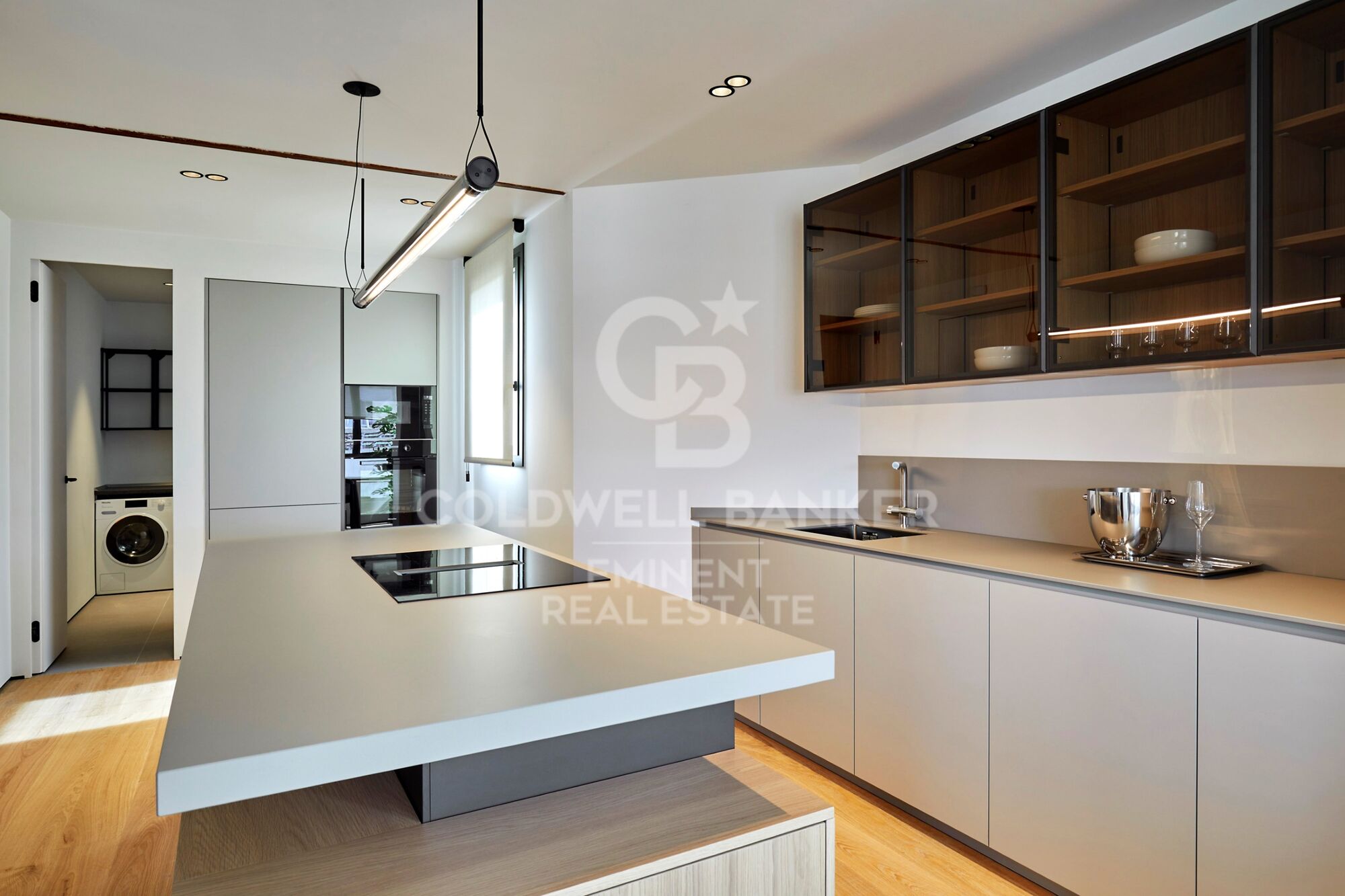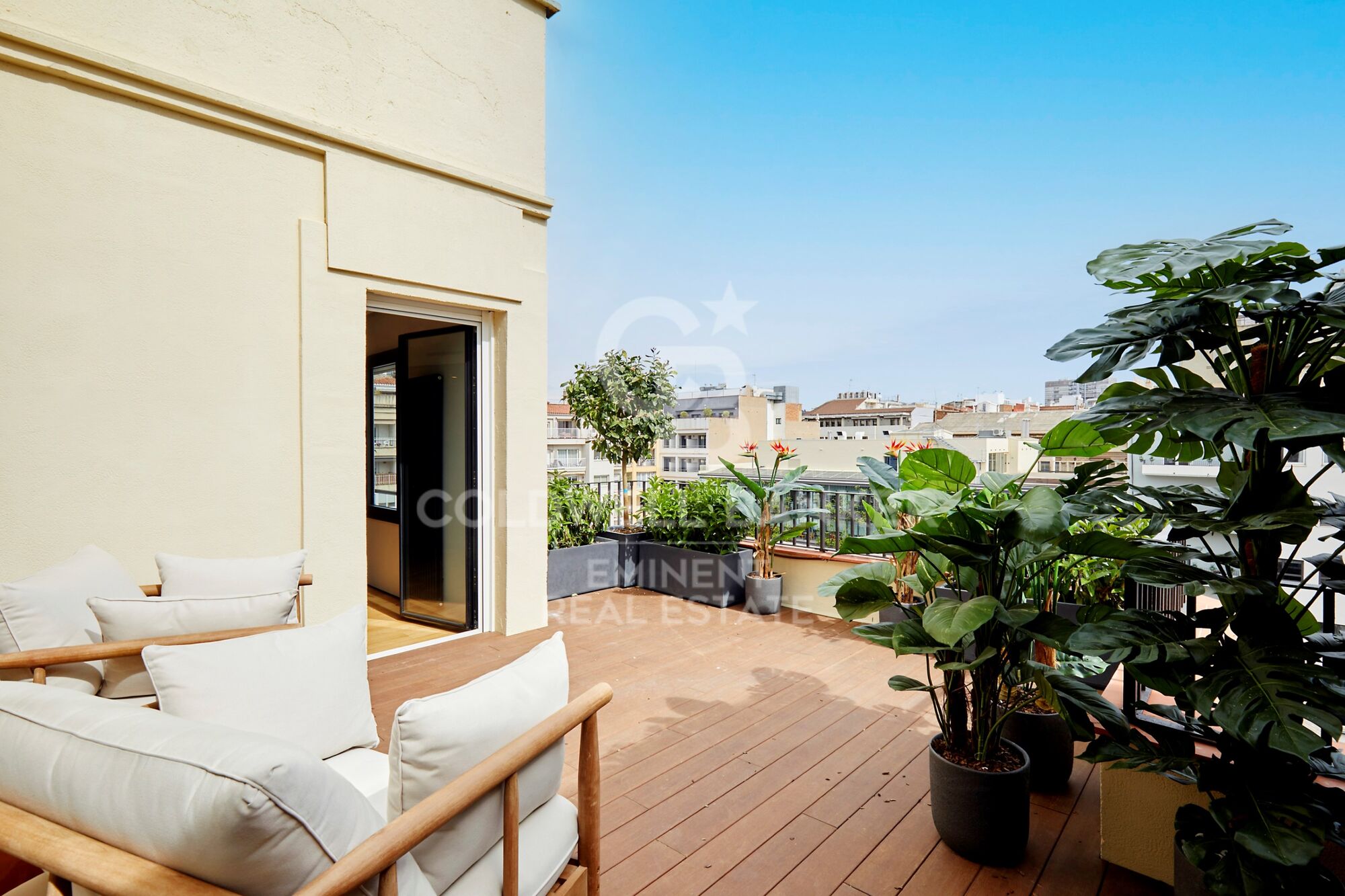 El amplio y luminoso salón da a la calle Muntaner y tiene acceso a otra terraza cubierta con vistas a la ciudad y a un precioso edificio modernista. Cocina americana abierta al salón. Sol de tarde en el salón y sol de mañana en los dormitorios con acceso a la terraza.