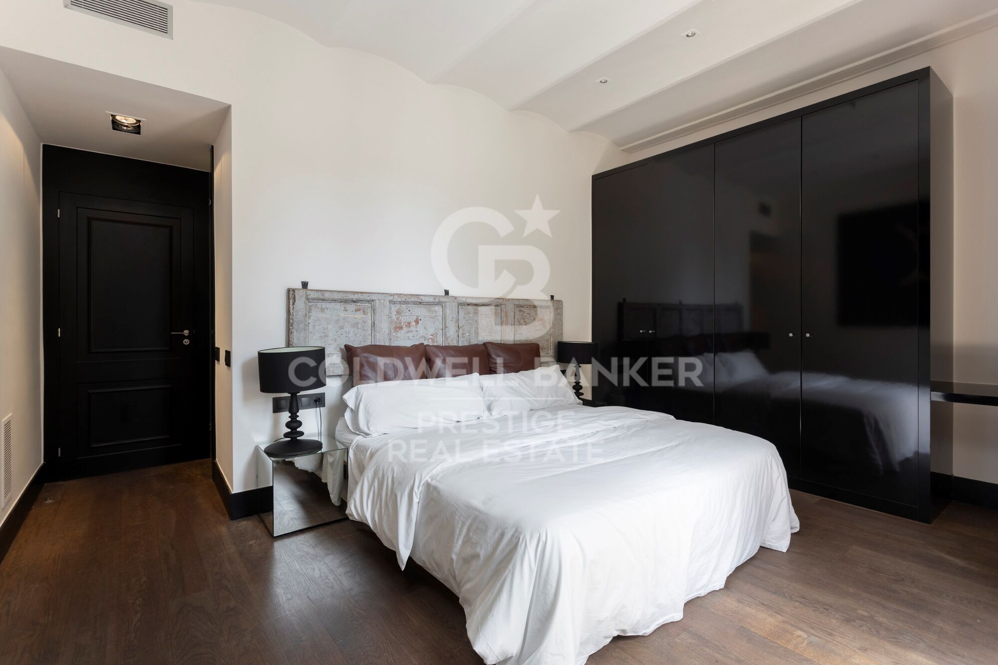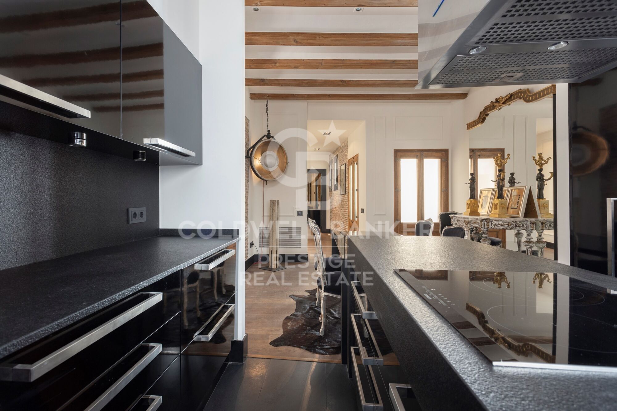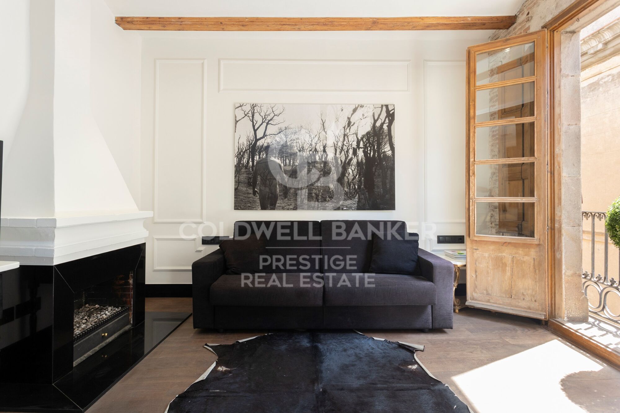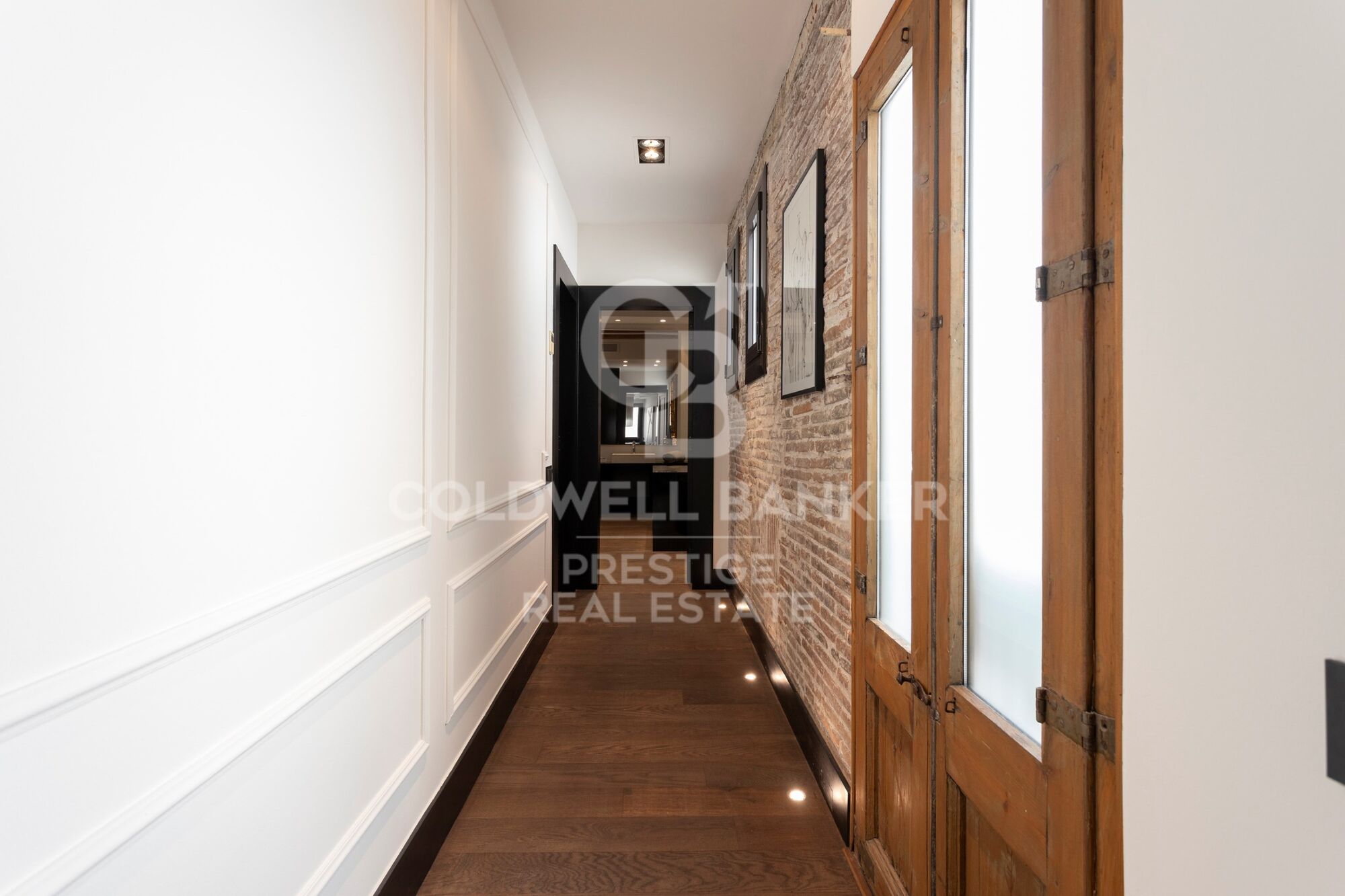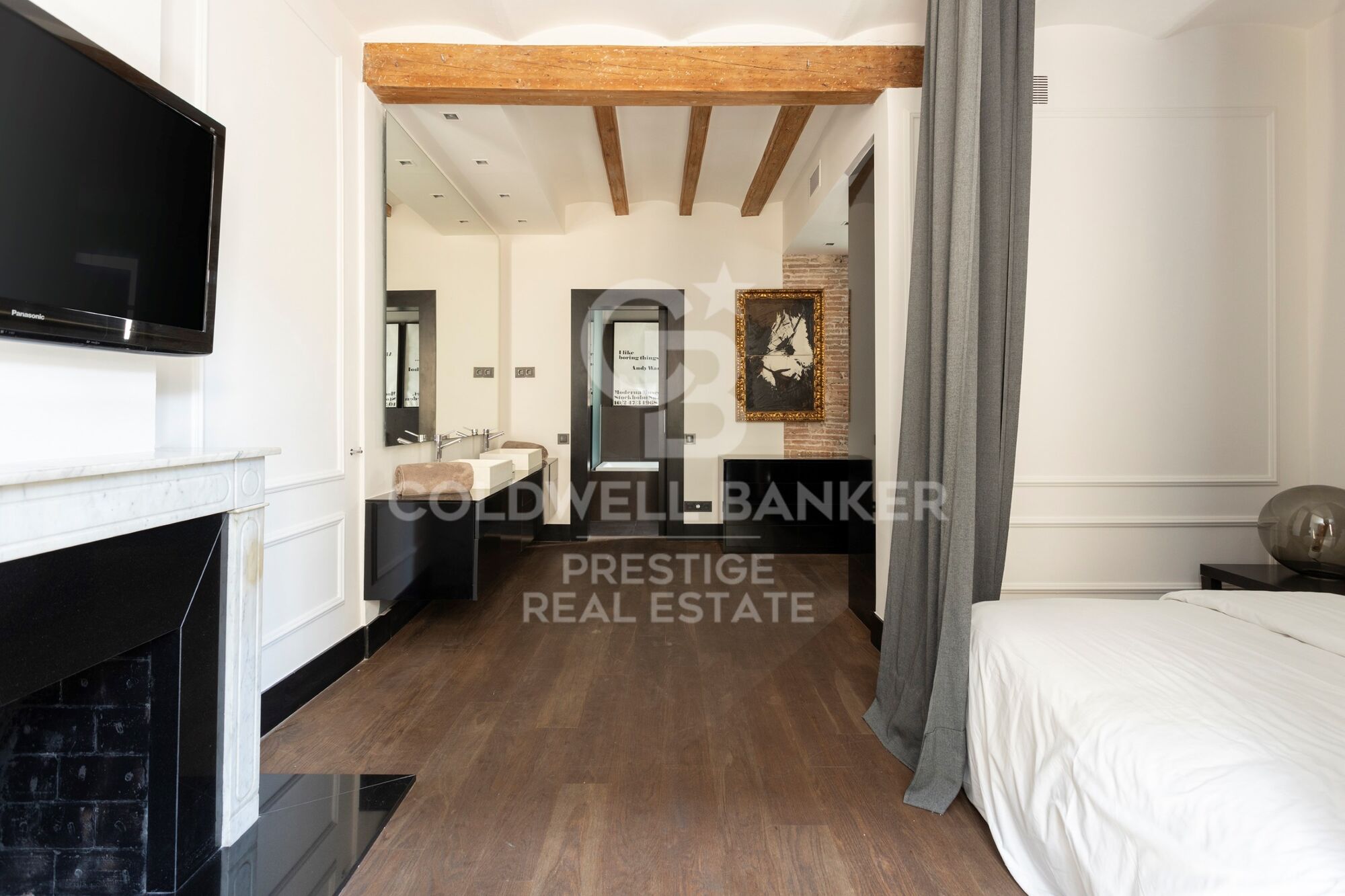 Entrando en el piso, un pasillo con elegante suelo original y un primer baño de cortesía, nos abre paso a la zona de día, con gran salón comedor con cocina abierta totalmente equipada. El salón destaca por unos grandes ventanales originales restaurados, los cuales brindan mucha luz a la zona. Conectada con el salón, encontramos una primera habitación que puede utilizarse como despacho, con una refinada chimenea.