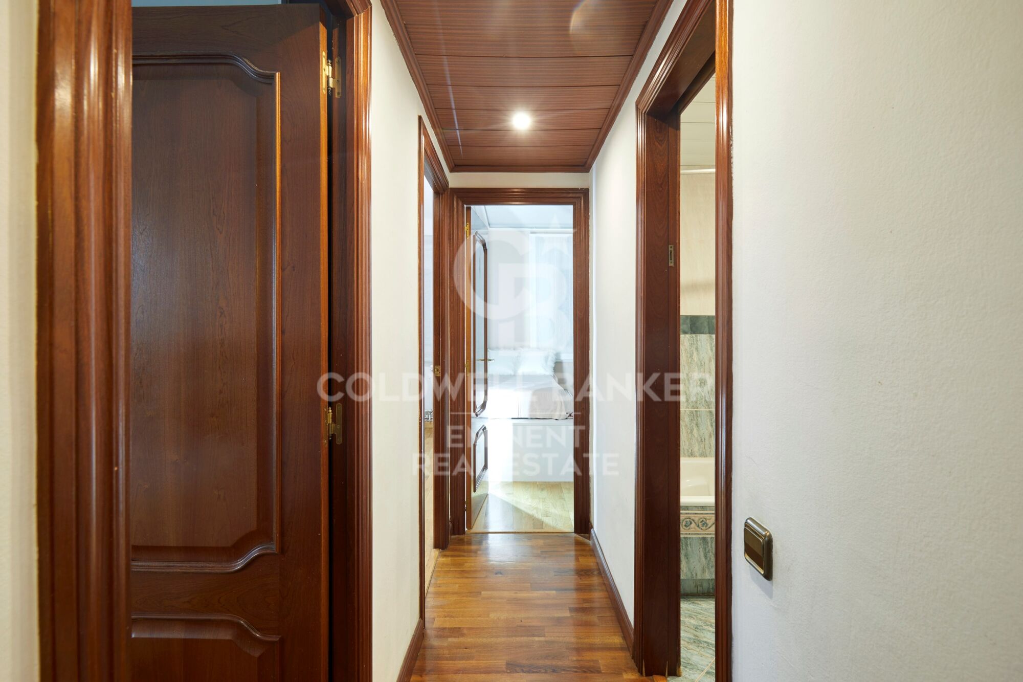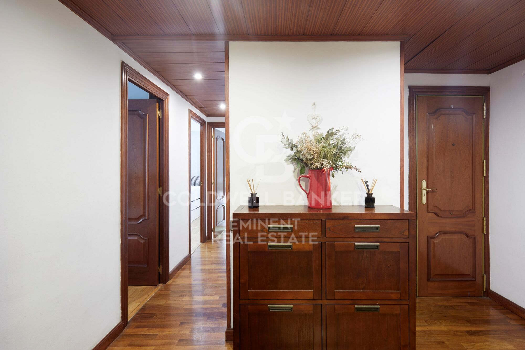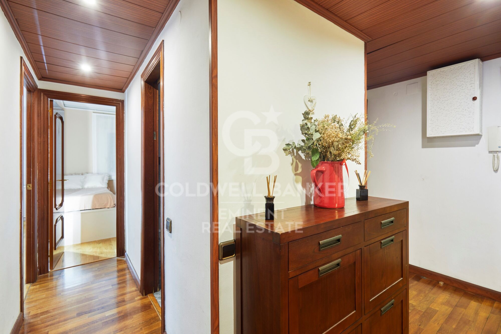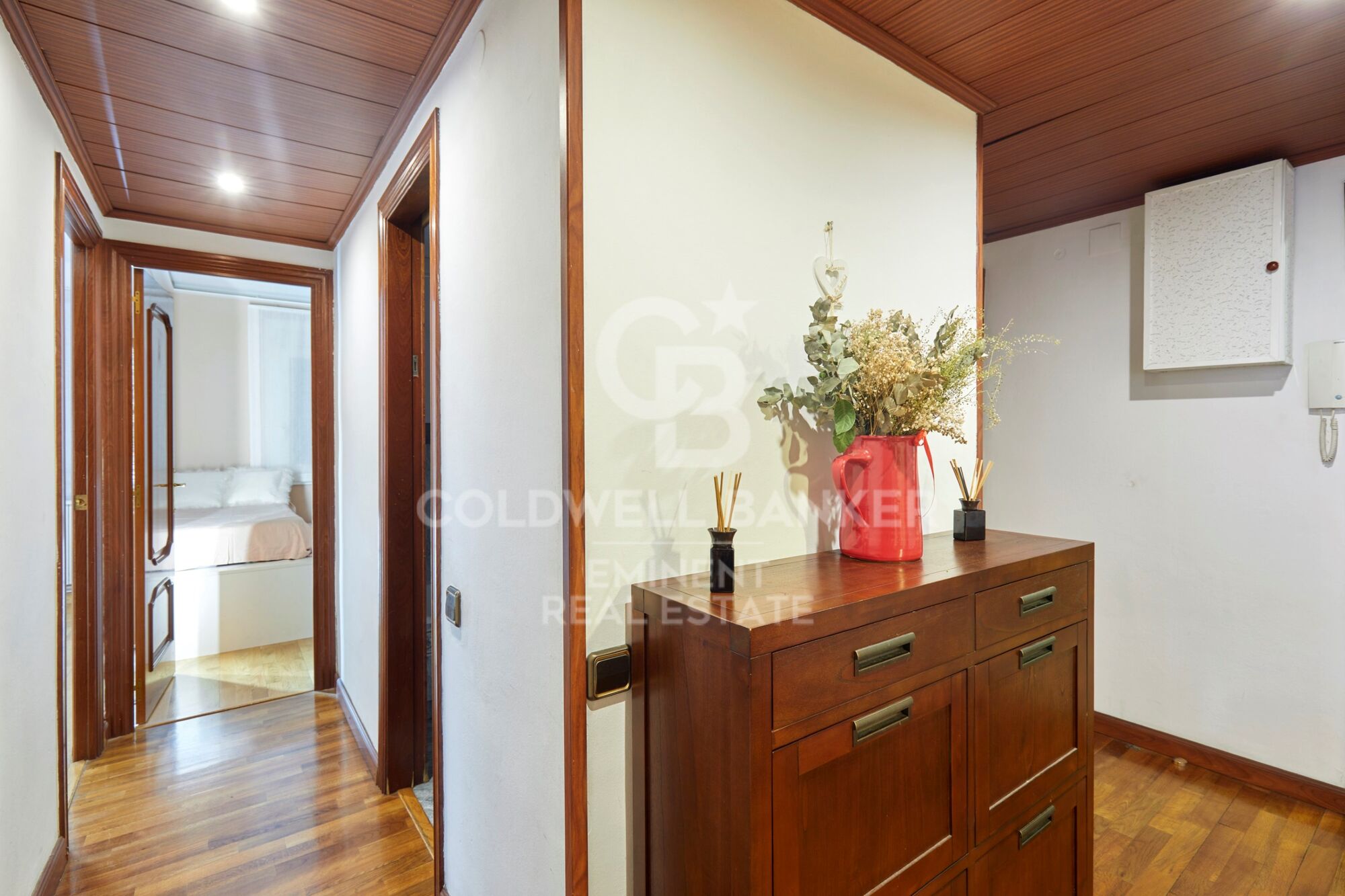 Además, la vivienda ofrece soluciones prácticas de almacenaje, incluyendo un espacio discreto en el techo del pasillo que permite aprovechar al máximo el espacio.