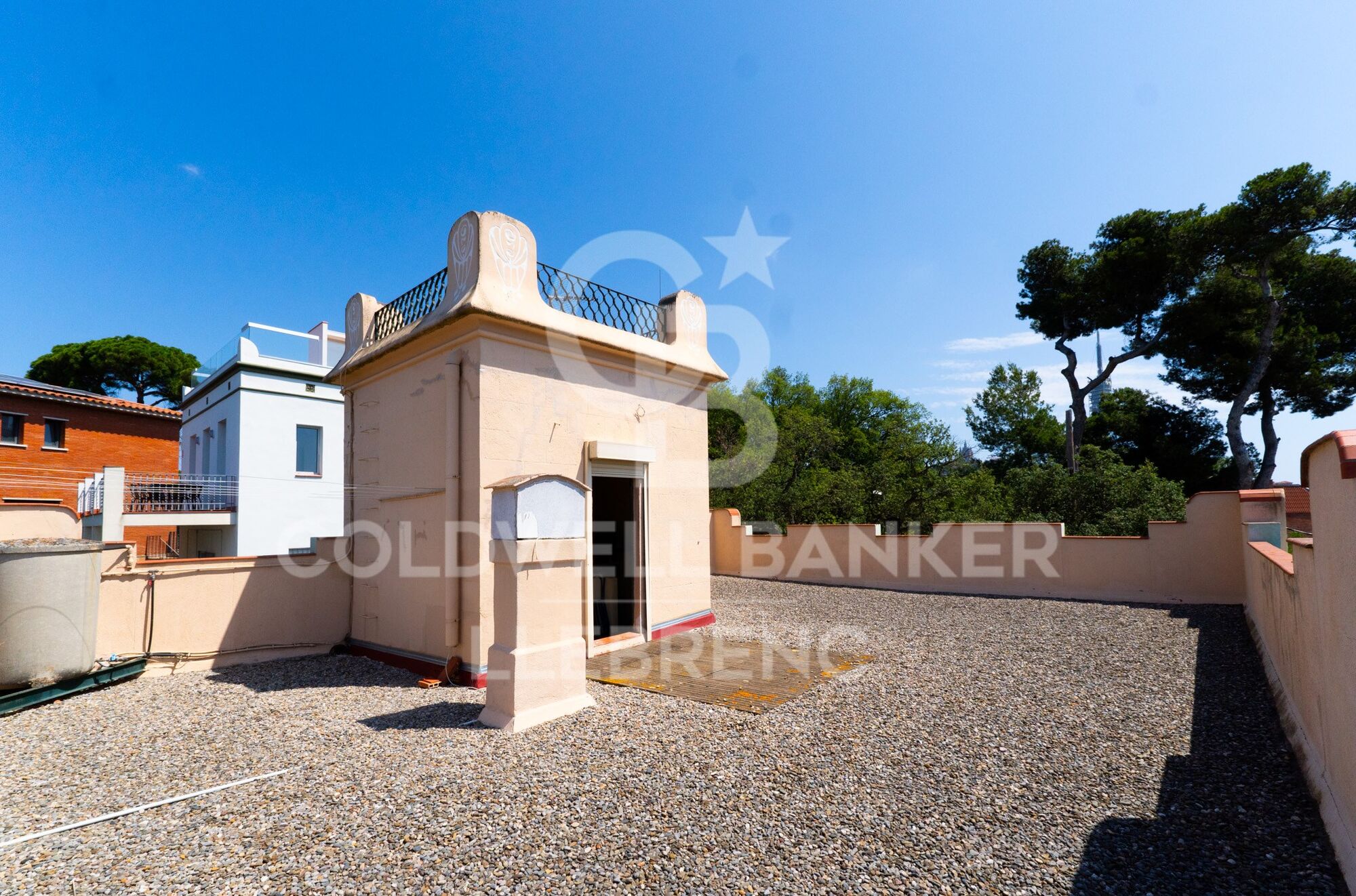 En la planta superior, encontrarás un pequeño estudio, una sala y una habitación con lavabo. En el nivel más alto, la casa dispone de cuatro habitaciones y dos lavabos, uno de ellos en suite. Toda la planta mantiene su estilo modernista con características distintivas como vidrieras, molduras y suelos hidráulicos. En la parte superior de la casa, dos terrazas una lateral y una panorámica ofrecen vistas impresionantes de Barcelona y el mar.
