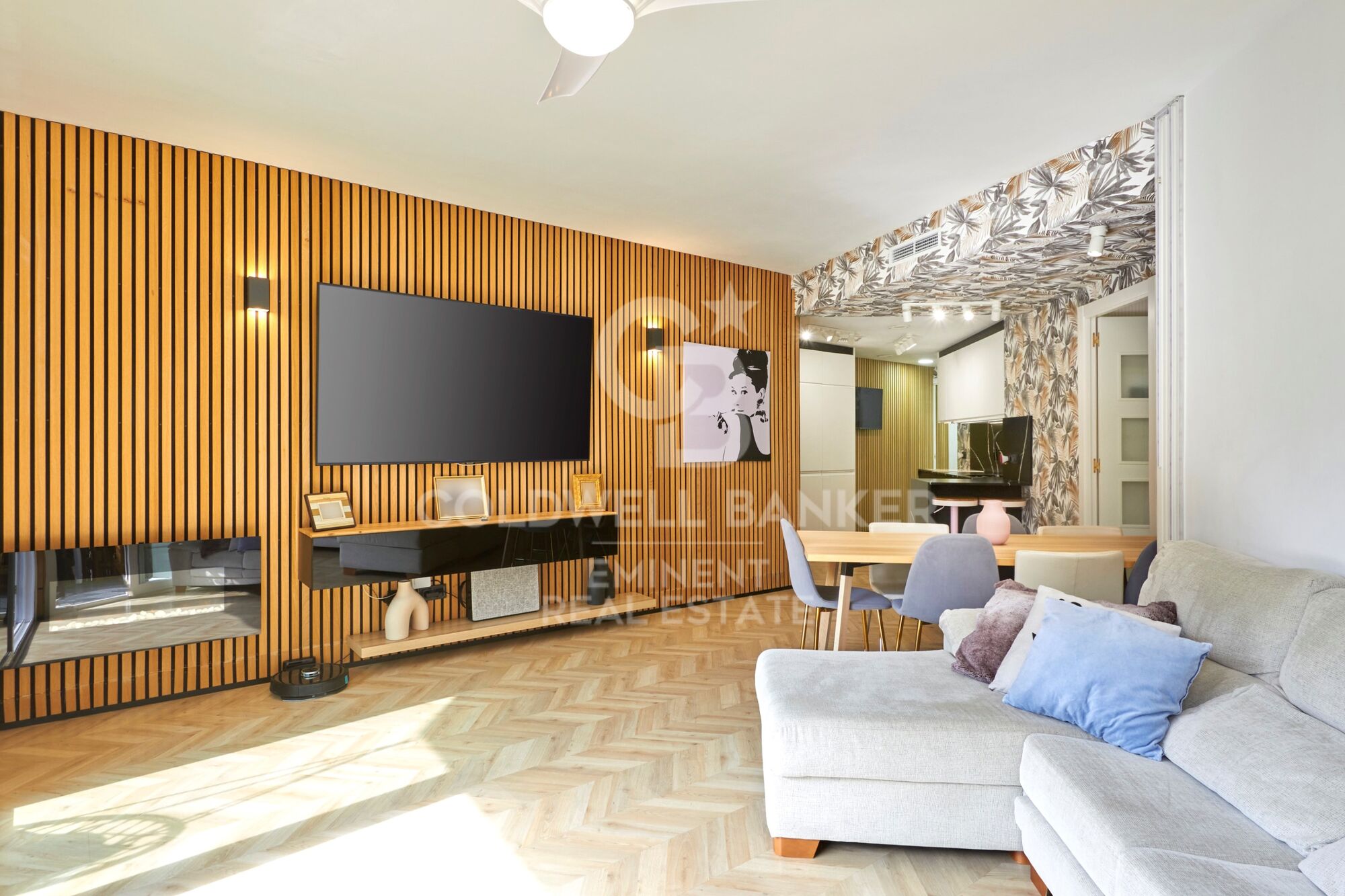 Un recibidor con armario empotrado y acabados de alta gama da paso a un salón-comedor bañado en luz natural, con cocina integrada de diseño (electrodomésticos Whirlpool panelados, isla central, acabados mate), comedor para ocho personas con acceso directo a una terraza esquinera que envuelve la vivienda.