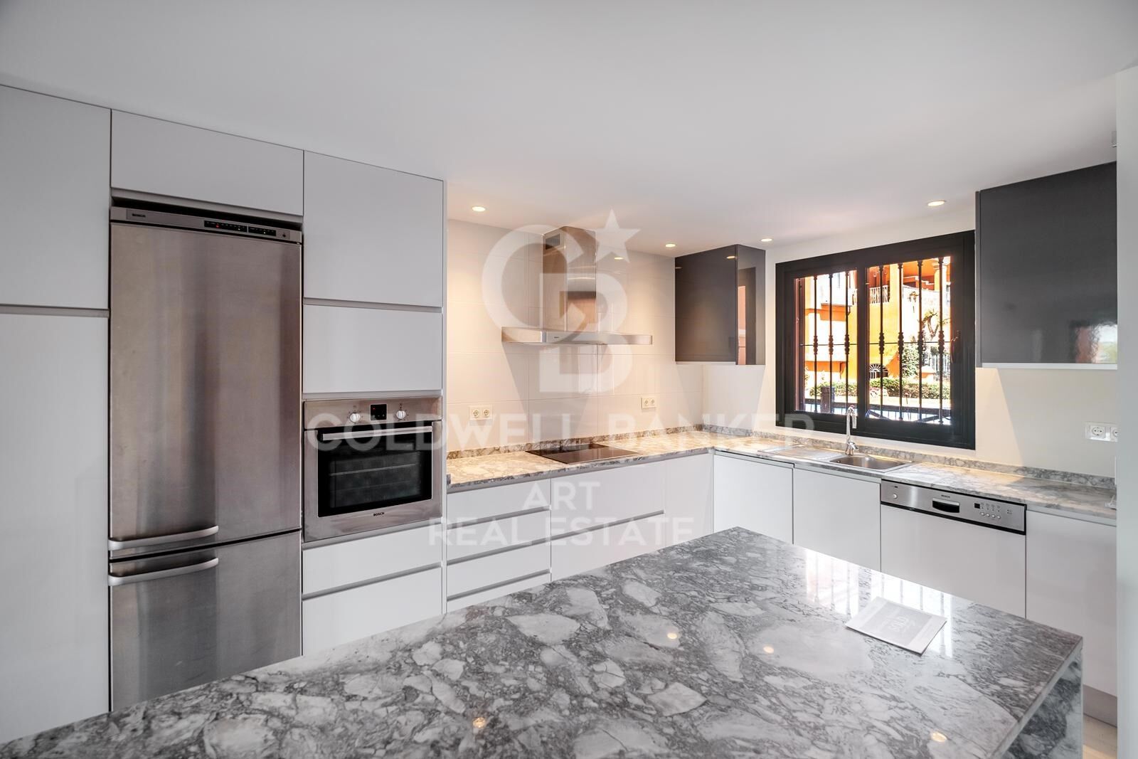 El apartamento cuenta con dos dormitorios bien equipados, cada uno con su propio baño en suite, que ofrecen privacidad y relajación. La sala de estar y el comedor de planta abierta desembocan en una cocina Bosch totalmente equipada, creando un espacio cálido y funcional, ideal para la vida diaria y el entretenimiento. Los elegantes suelos de mármol complementan el exterior tradicional de estilo terracota, mientras que los grandes ventanales llenan la casa de luz natural. Una característica destacada es la terraza de 17 m² orientada al sur, que ofrece vistas panorámicas del mar Mediterráneo y las montañas circundantes, perfecta para cenar al aire libre o veladas tranquilas.