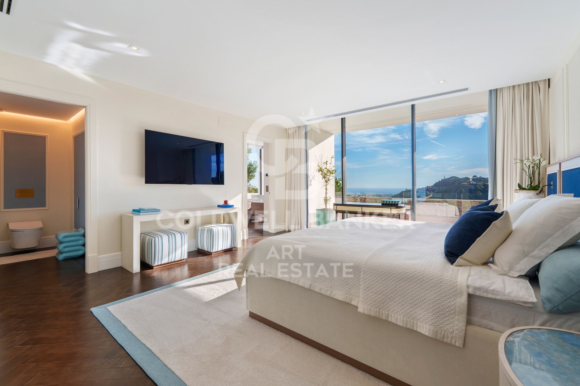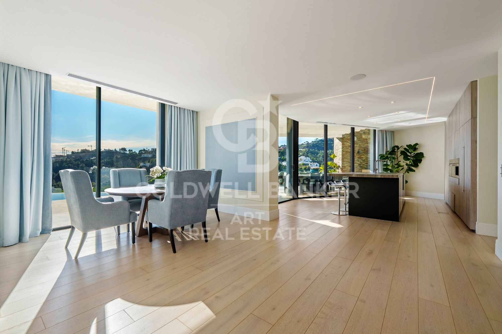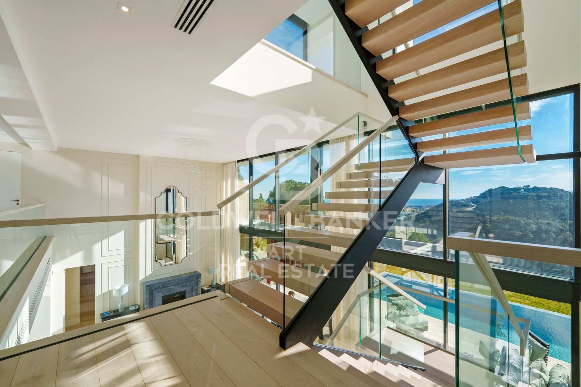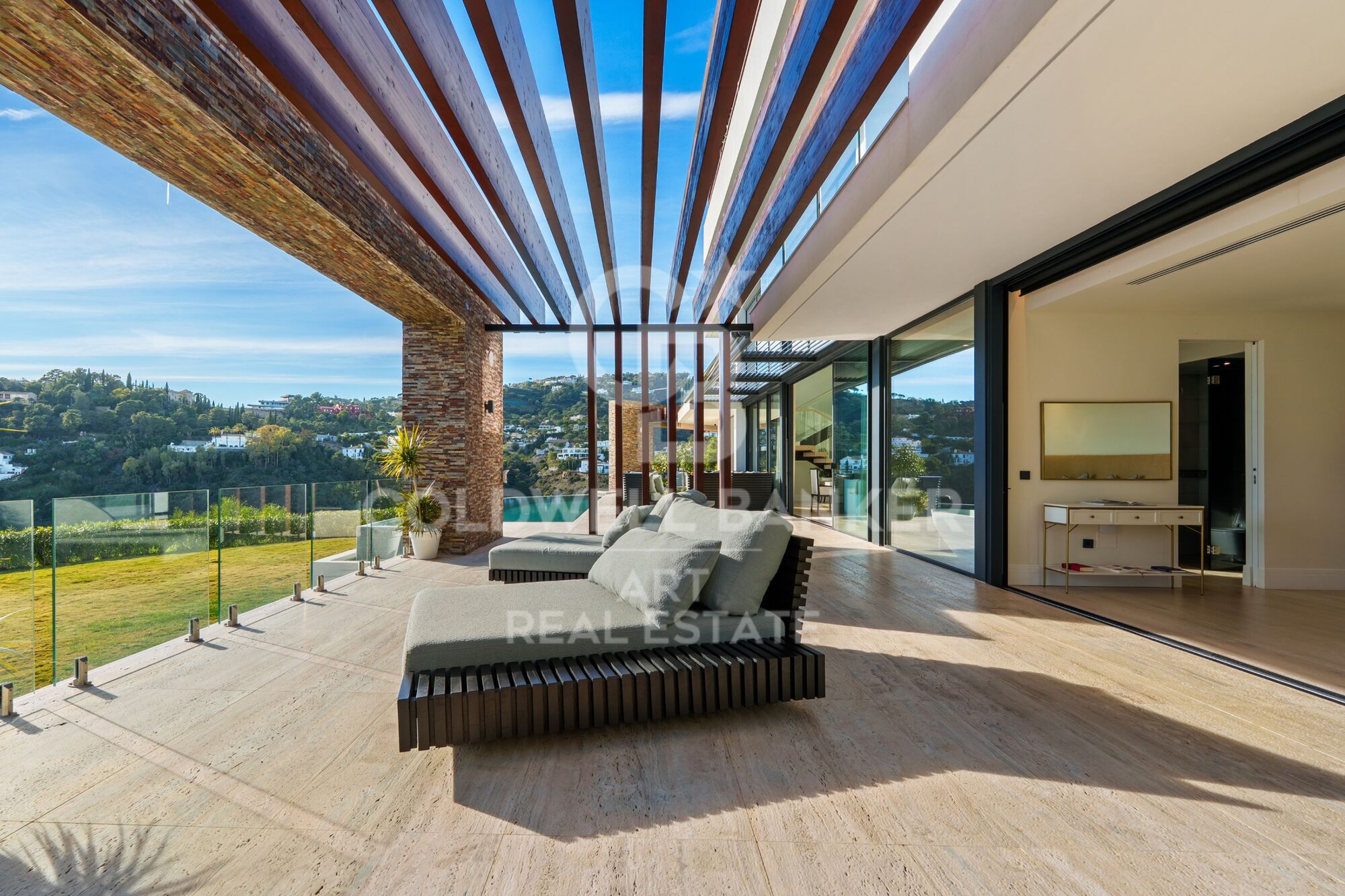 Ubicada en una urbanización cerrada con seguridad armada, una autorización poco común en España y un tiempo de respuesta inferior a cinco minutos, la casa está diseñada para quienes valoran la privacidad y buscan la comodidad. La distribución es clara y deliberada. Las habitaciones privadas se ubican en la planta superior, mientras que los espacios sociales se despliegan a nivel del jardín. La suite principal ocupa su propio espacio con vestidor y biblioteca. En la planta baja, las zonas de estar equilibran el uso formal e informal sin excesos. ¿Con qué frecuencia se encuentra una casa que permite disfrutar del entretenimiento sin renunciar a la comodidad en un día laborable normal? Las amplias aberturas invitan a las terrazas y la piscina, donde las vistas panorámicas son ininterrumpidas.