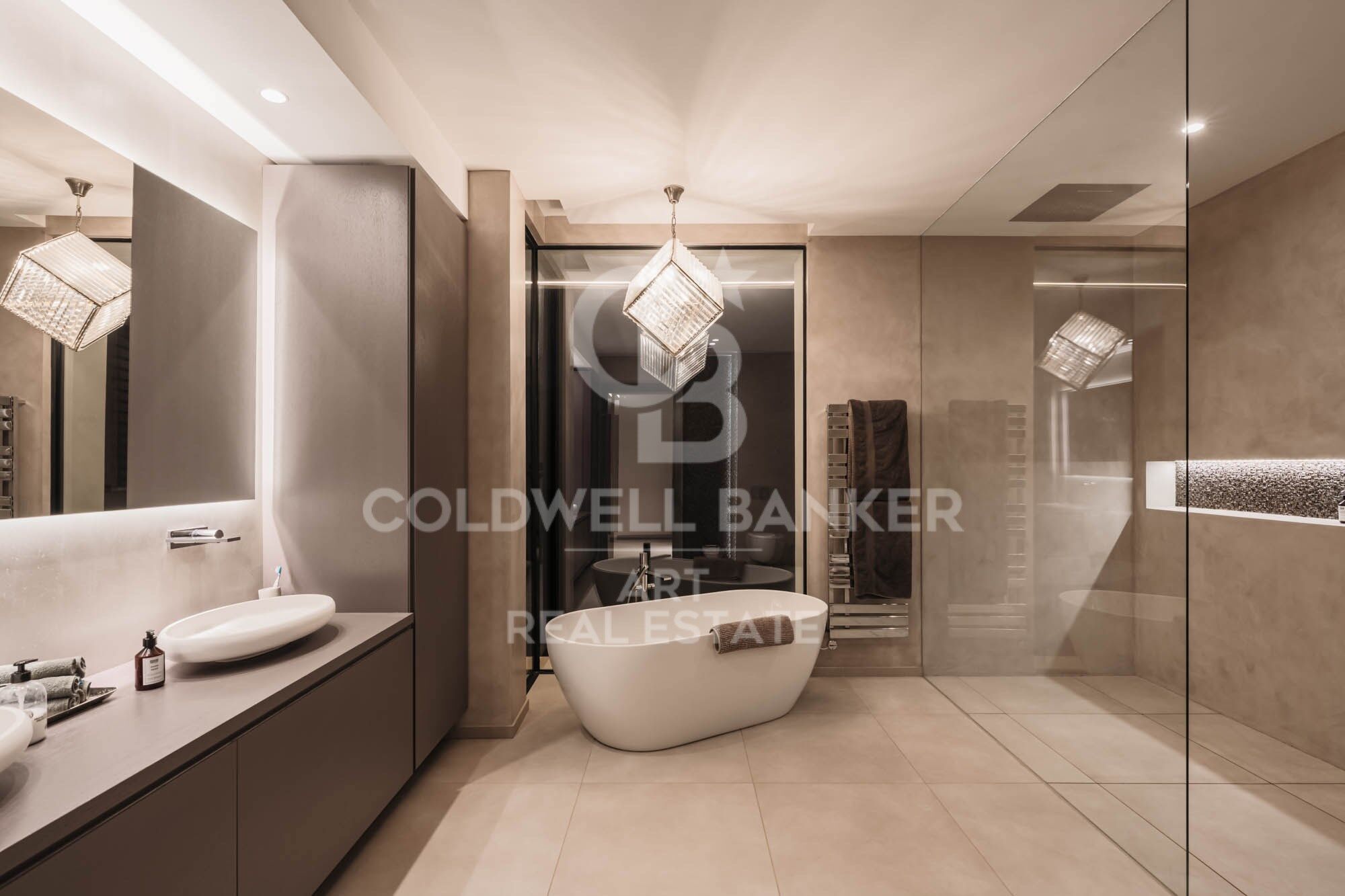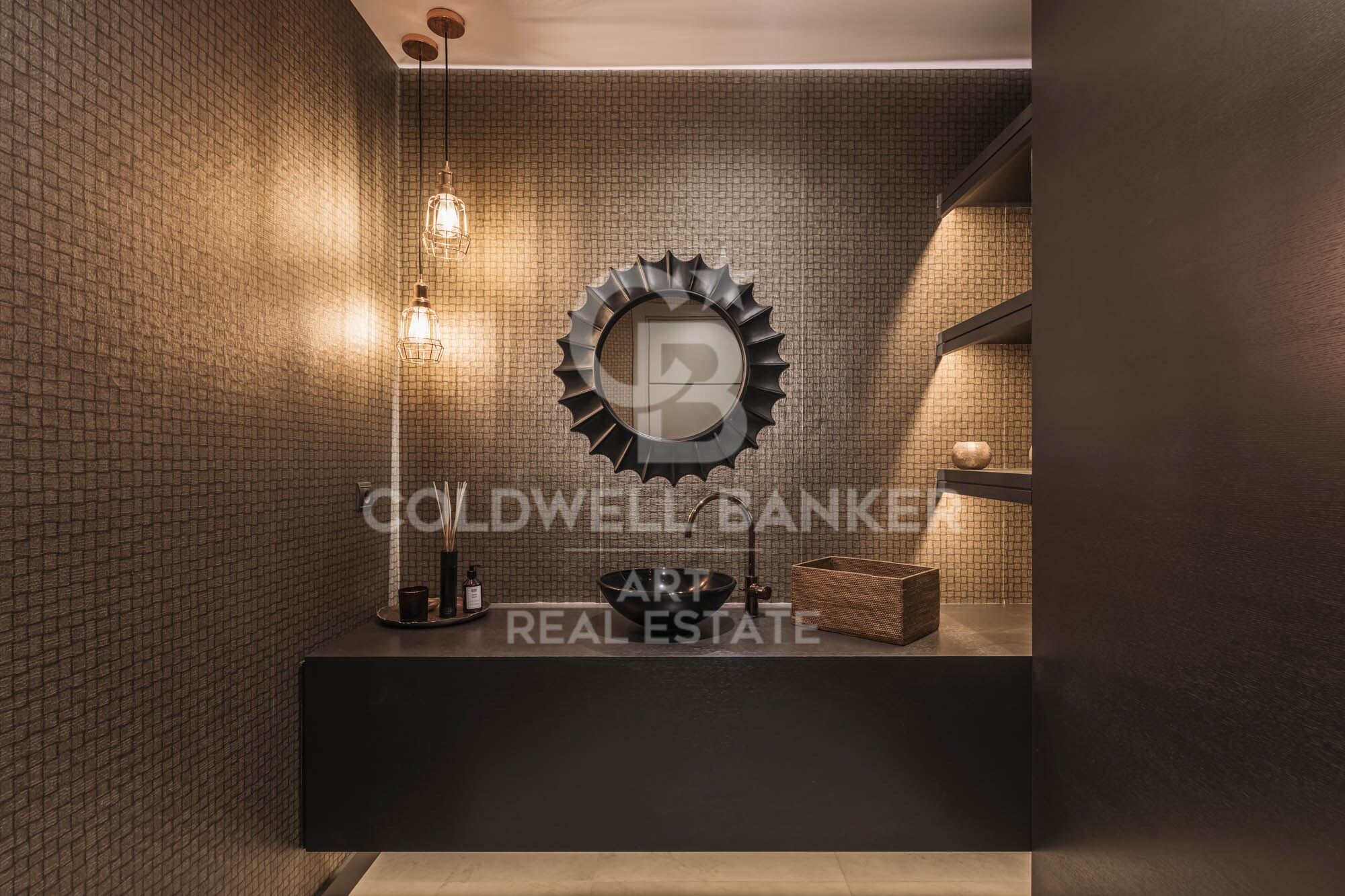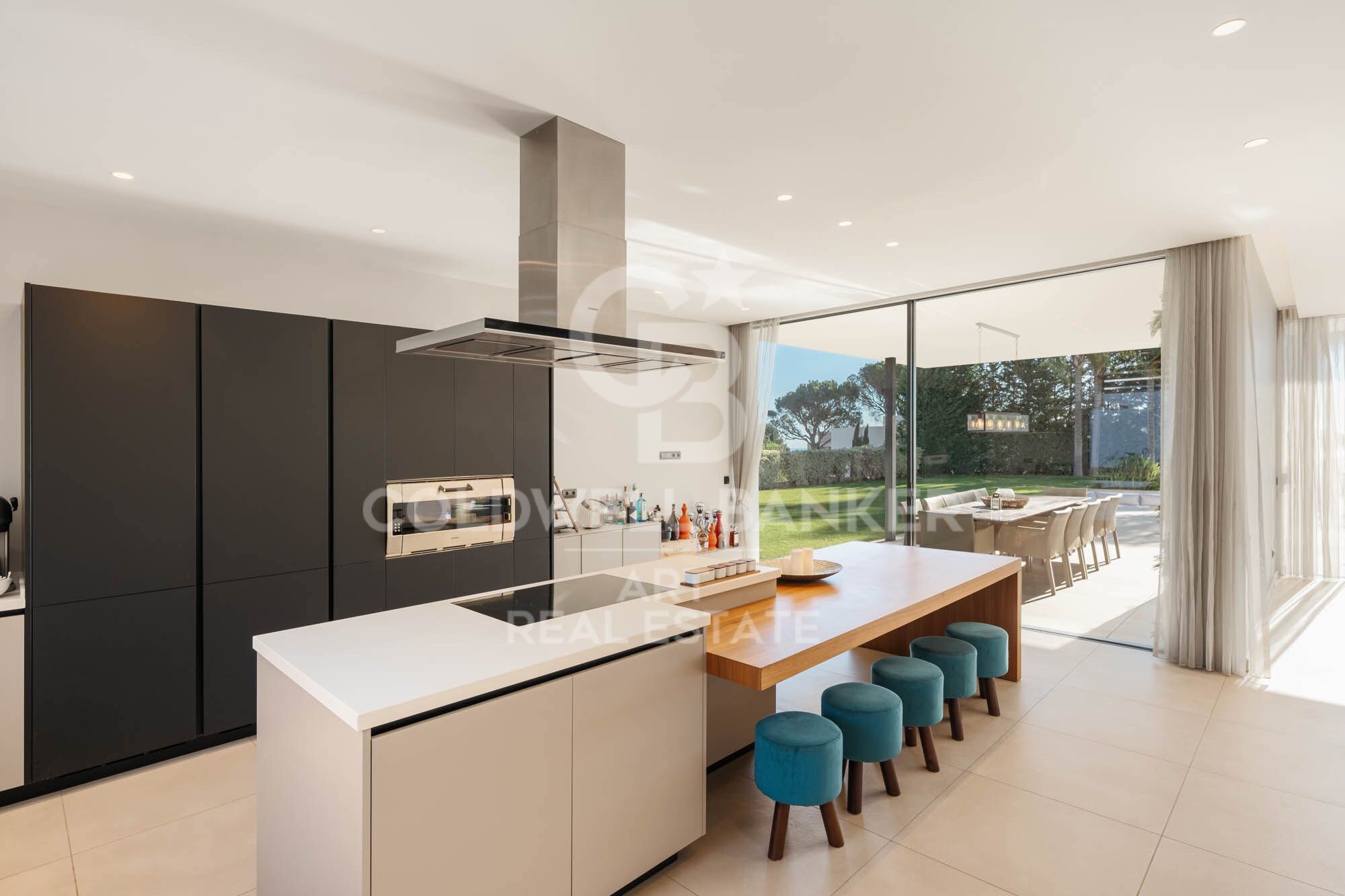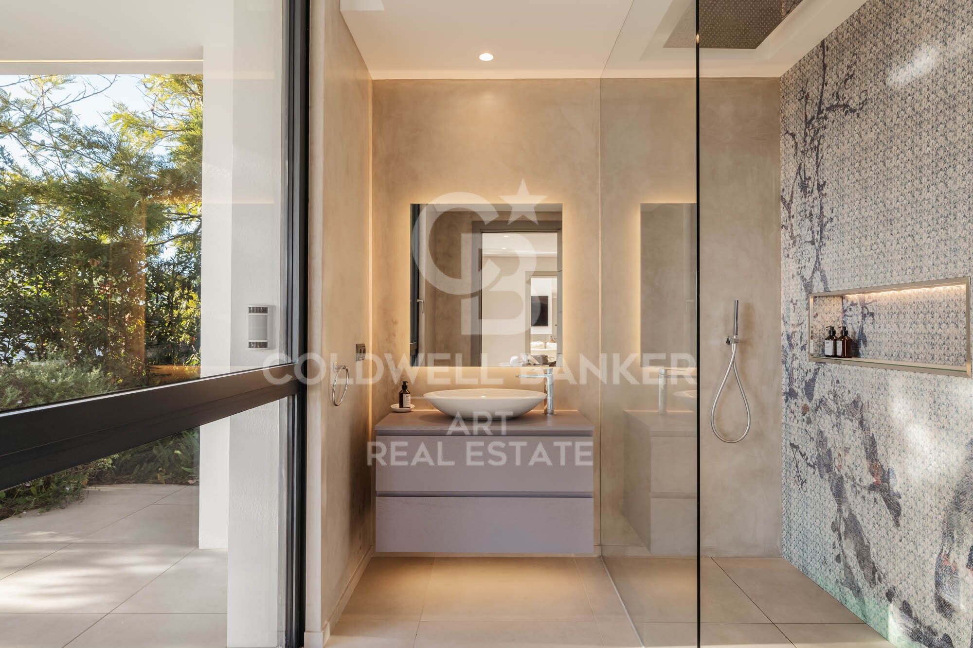 La villa dispone de cinco dormitorios en suite, un aseo de invitados y un apartamento independiente para invitados, diseñado con los mismos estándares de calidad que la residencia principal. Cada espacio refleja una sofisticación discreta, con electrodomésticos Gaggenau, persianas eléctricas, un sistema de alarma avanzado y riego automático en el jardín.