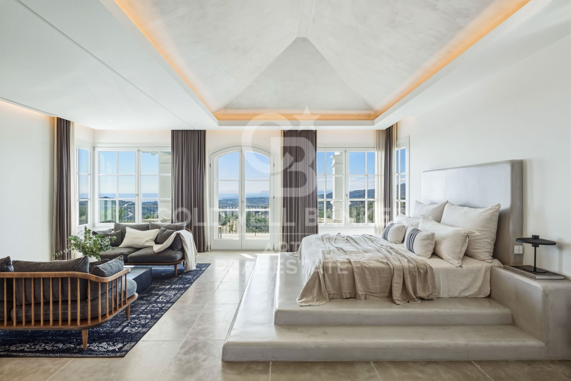En la planta superior se encuentra la suite principal con vestidor y baño de lujo, además de dos dormitorios adicionales y un baño completo. Entre sus comodidades destacan gimnasio privado, sauna, baño de vapor, sala de cine con Bang & Olufsen, amplias terrazas con vistas panorámicas, cocina exterior con barbacoa y espacios de ocio.