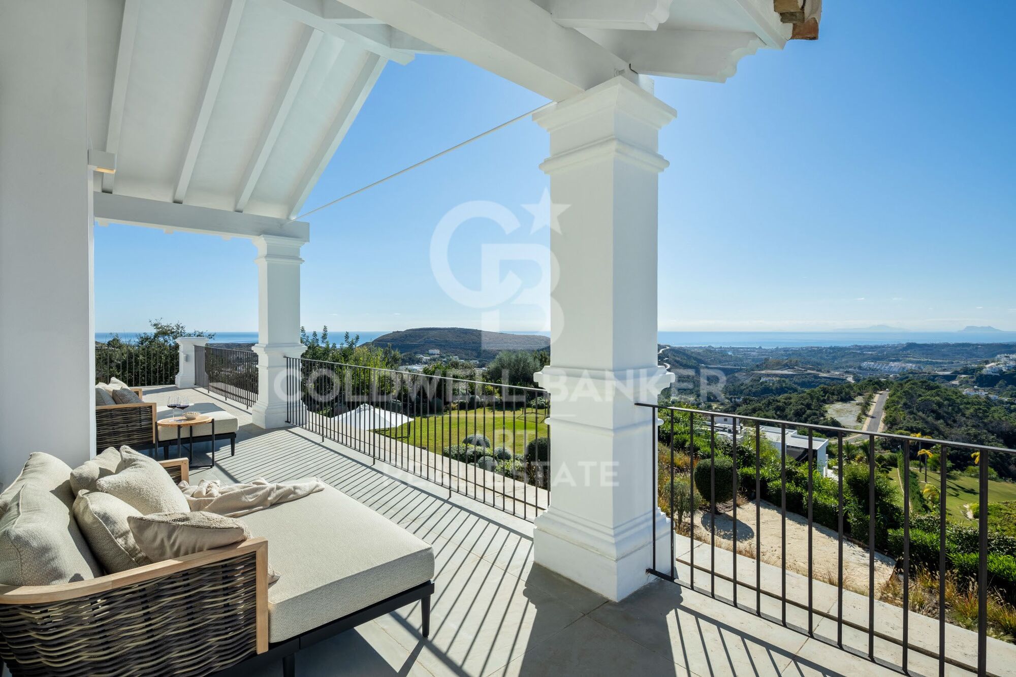 En la planta superior se encuentra la suite principal con vestidor y baño de lujo, además de dos dormitorios adicionales y un baño completo. Entre sus comodidades destacan gimnasio privado, sauna, baño de vapor, sala de cine con Bang & Olufsen, amplias terrazas con vistas panorámicas, cocina exterior con barbacoa y espacios de ocio.