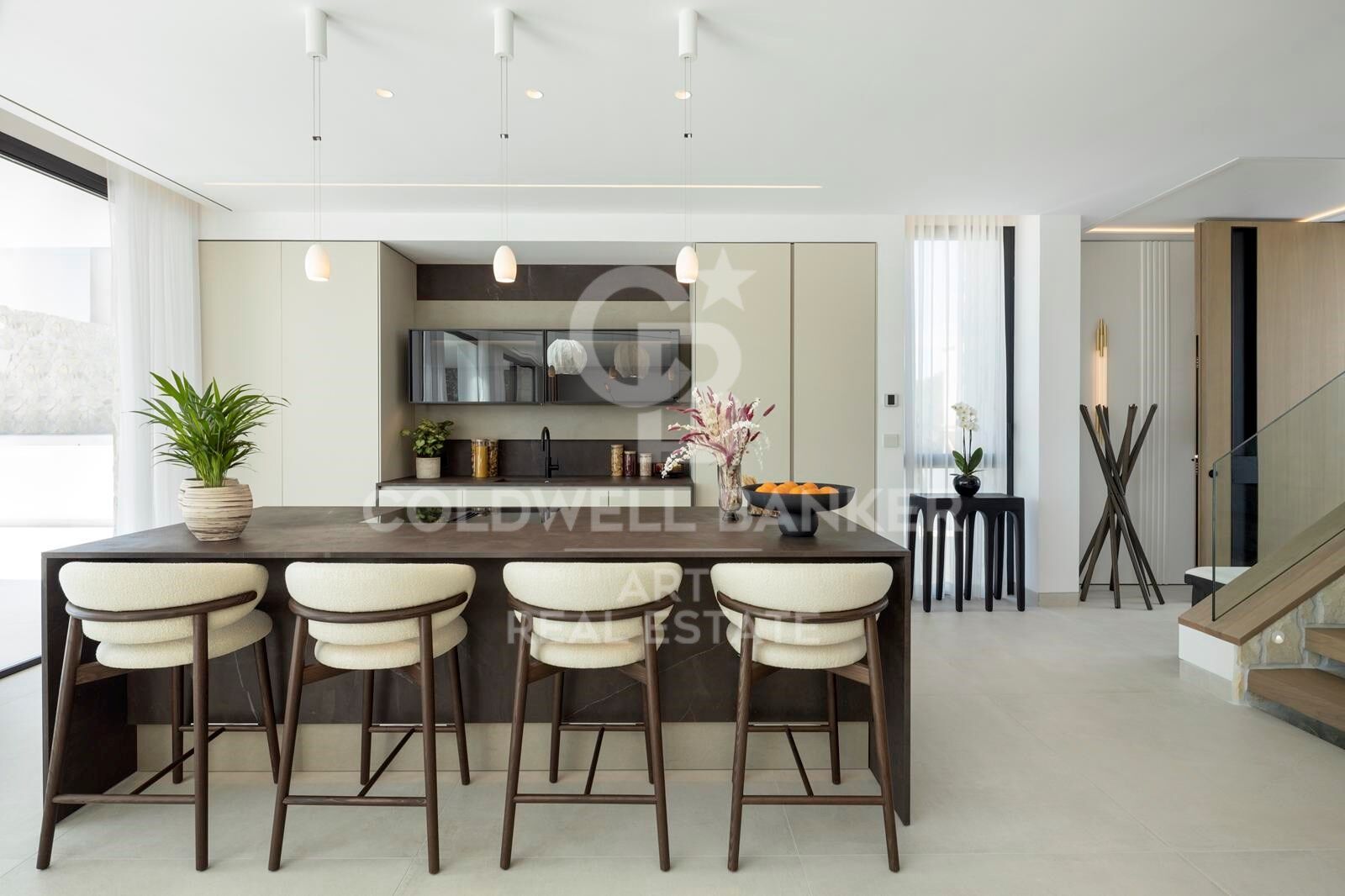 En el corazón del hogar se encuentra un espacio diáfano de 120 m² que integra cocina y salón, conectando de manera fluida con la zona de comedor y abriéndose directamente a una terraza orientada al sur. Desde aquí se accede a la zona de la piscina de agua salada, ideal para disfrutar del sol todo el año y de una conexión armoniosa entre interior y exterior.