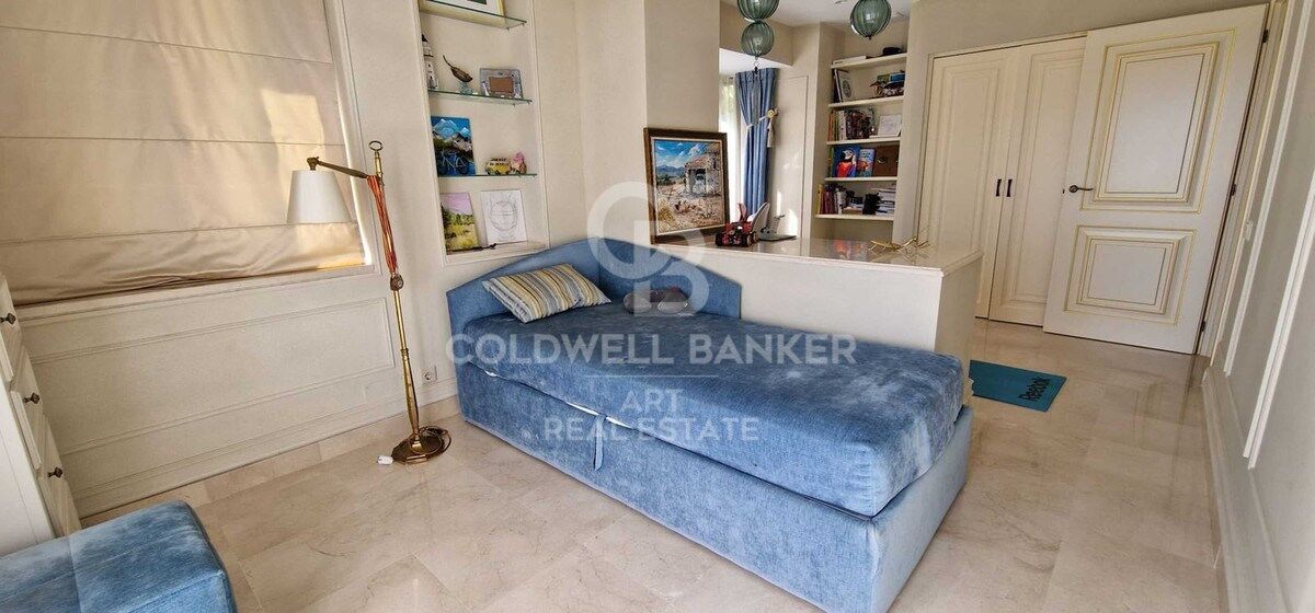 En el exterior, la vivienda dispone de un jardín con palmeras maduras, zonas de césped y piscina privada, además de amplias terrazas ideales para disfrutar del clima mediterráneo durante todo el año. Grandes ventanales inundan la casa de luz natural.