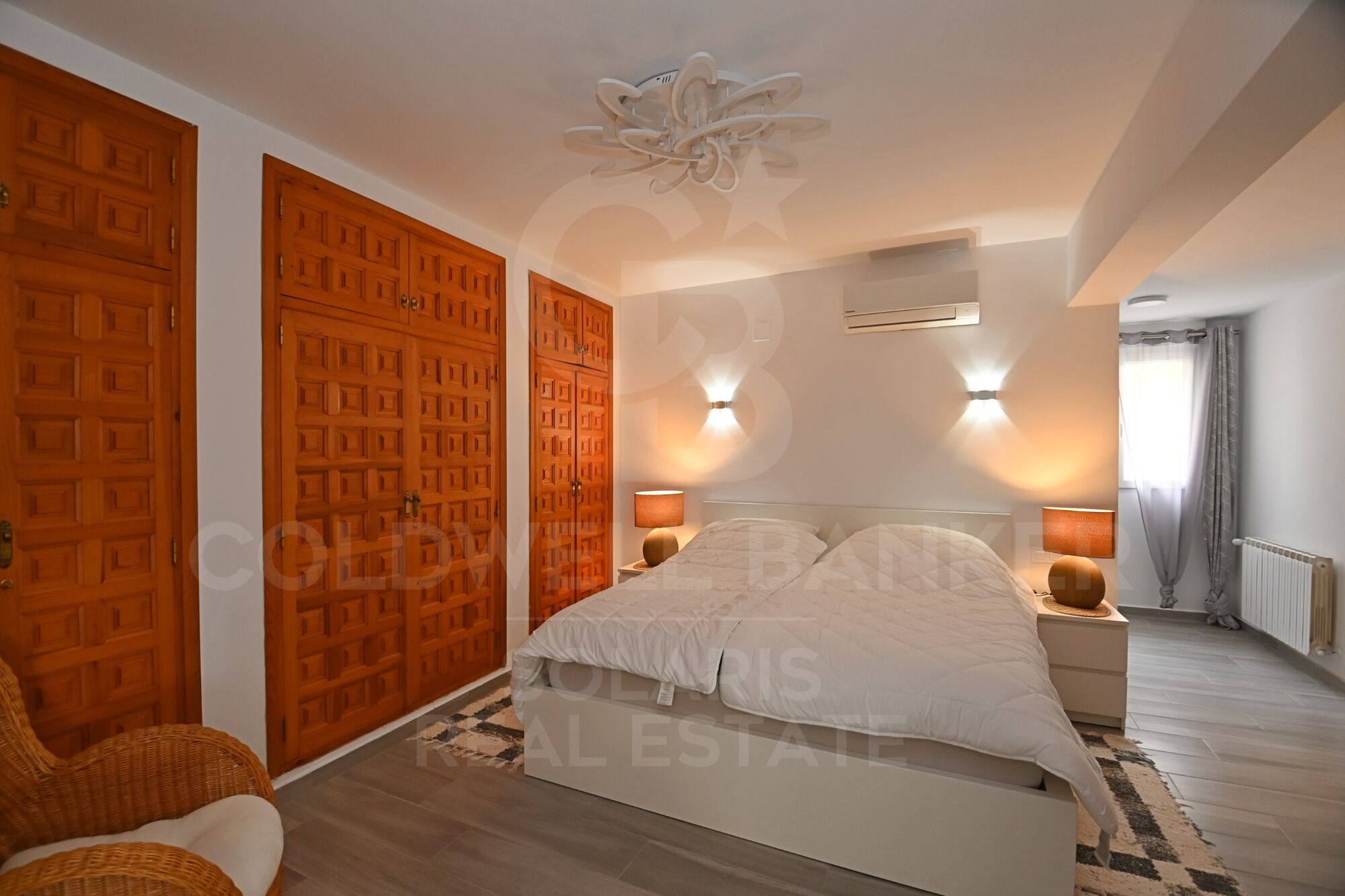 En el nivel más bajo de la propiedad se encuentra un apartamento privado con acceso independiente (y también comunicable con la vivienda principal), ideal para invitados o como alojamiento turístico. Dispone de cocina y comedor completamente equipados, salón, dormitorio, baño y sistema de alarma propio. Desde este nivel también se disfrutan las vistas al mar y se accede directamente a la piscina y la terraza a través de varias salidas exteriores.