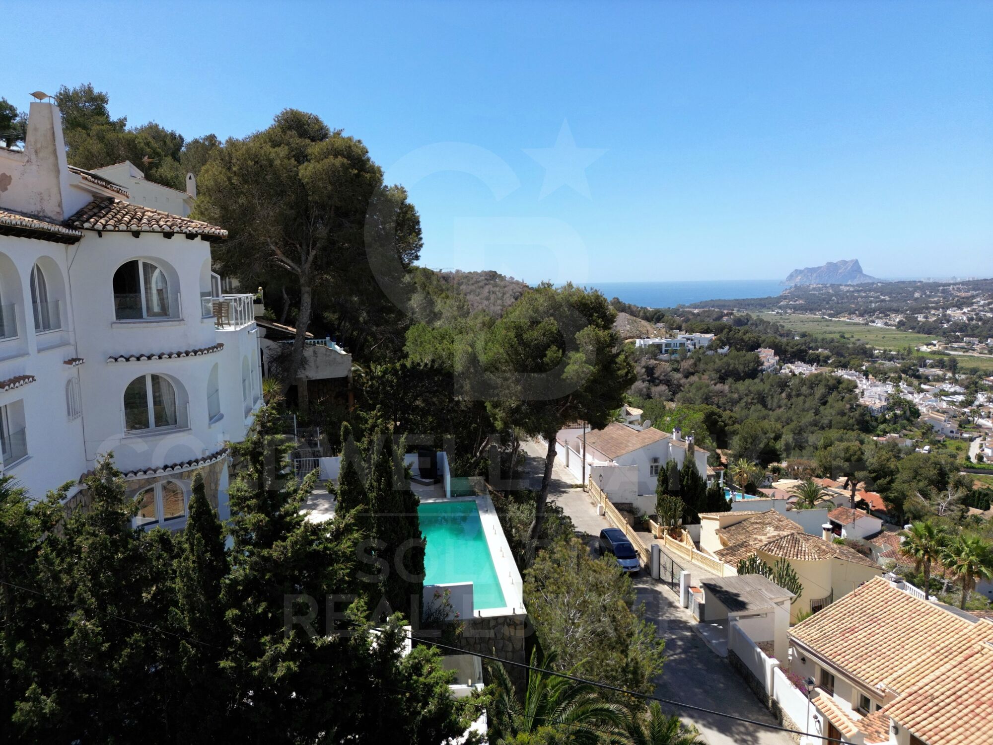 Esta encantadora villa se sitúa en una posición elevada cerca del núcleo urbano de Moraira, en la codiciada Costa Blanca Norte. Desde su privilegiada ubicación, ofrece impresionantes vistas panorámicas que abarcan el mar Mediterráneo, el paisaje circundante y puntos emblemáticos como el Peñón de Ifach en Calpe.