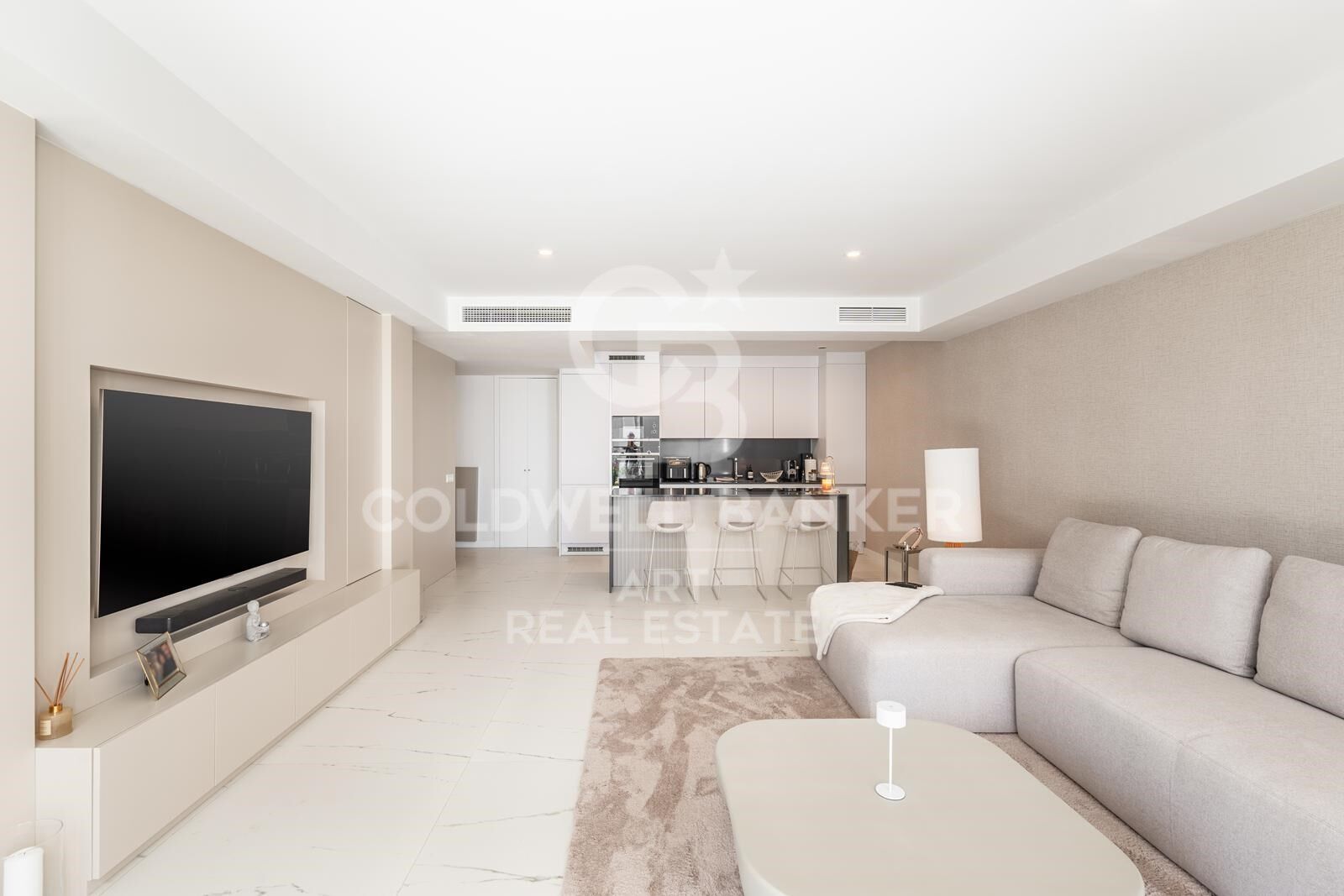 El interior dispone de dos dormitorios y dos baños, incluyendo una suite principal con vestidor y acceso directo a la terraza privada. La cocina totalmente equipada se integra perfectamente con el salón y el comedor, que se abren a una terraza cubierta y a un jardín privado, ideal para relajarse o disfrutar de momentos al aire libre.