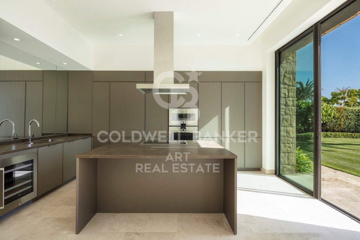 Distribuida en dos plantas, la villa ofrece una conexión fluida con el exterior desde la planta baja, donde un espacioso salón, comedor y cocina se abren hacia los jardines. Con techos altos y grandes ventanales, el interior se baña de luz natural, creando una sensación de amplitud y armonía. La cocina, completamente equipada con electrodomésticos Gaggenau de última generación, es un verdadero paraíso para los amantes de la gastronomía.