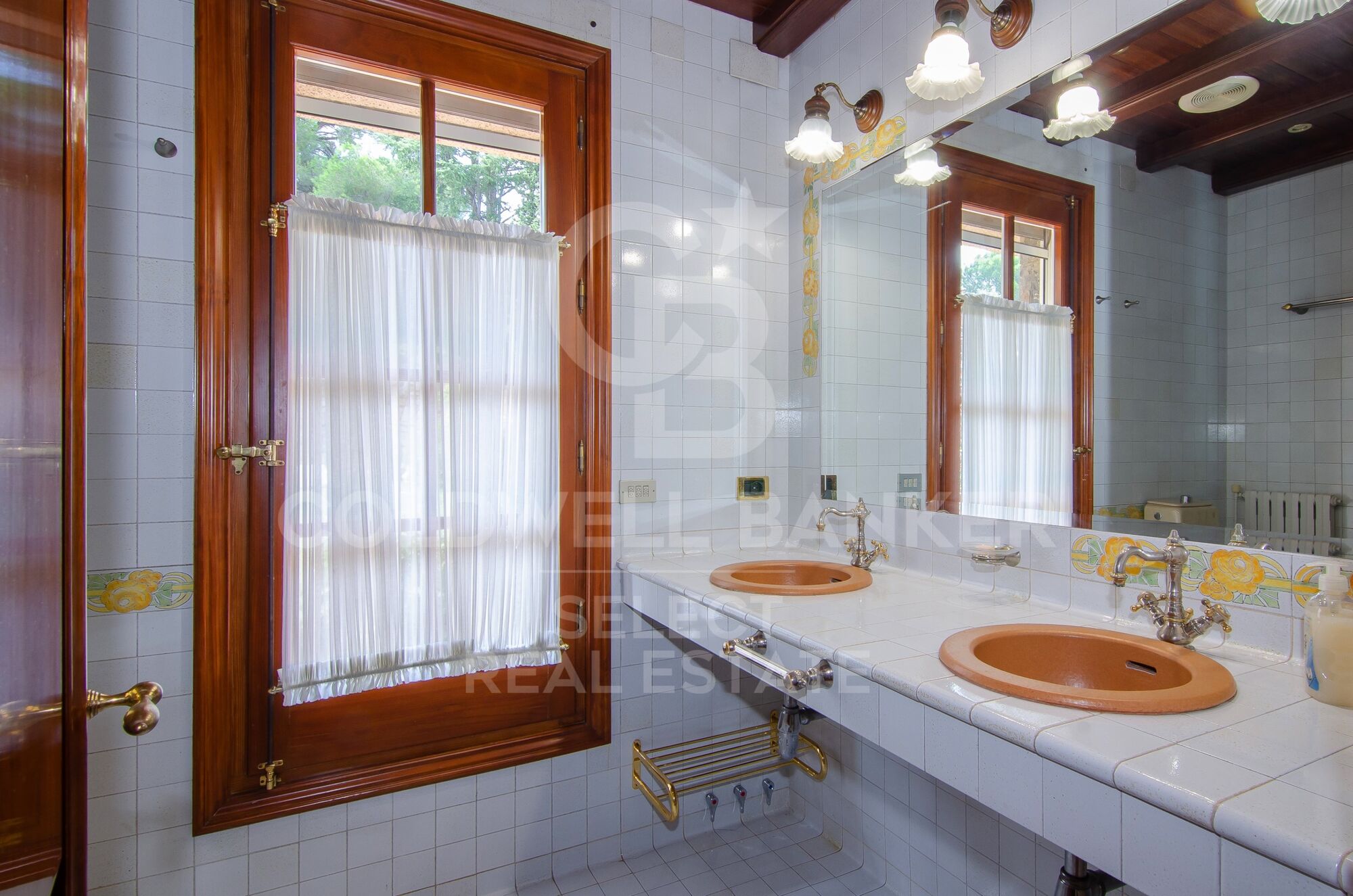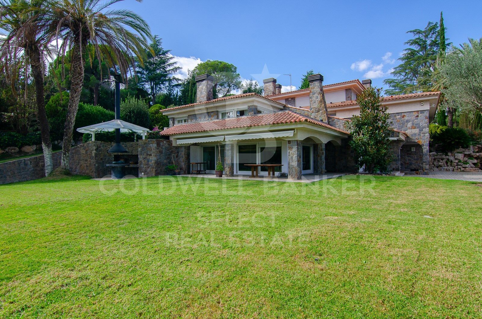 El solar de 2.600m2 es magnífico y preserva la casa celosamente de forma que solamente accedemos a ella a través de una bonita rampa rodada. Este señorial acceso nos adelanta, a base de piedra y ornamentación vegetal, el estilo mediterráneo de la propiedad. Efectivamente, una vez arriba descubres los arcos cubiertos de piedra que enmarcan las terrazas y los pavimentos exteriores que decoran y se funden con el jardín. Gozamos la visión de una imponente casa junto con su jardín perfectamente cuidado que se extiende hasta el final del mismo, donde pareces estar flotando por encima del entorno. Unos cuantos pinos muy grandes acaban de enmarcar la propiedad y dan el toque perfecto que la hacen excepcional y relajante. En medio, una maravillosa piscina nos invita a sumergirnos.
