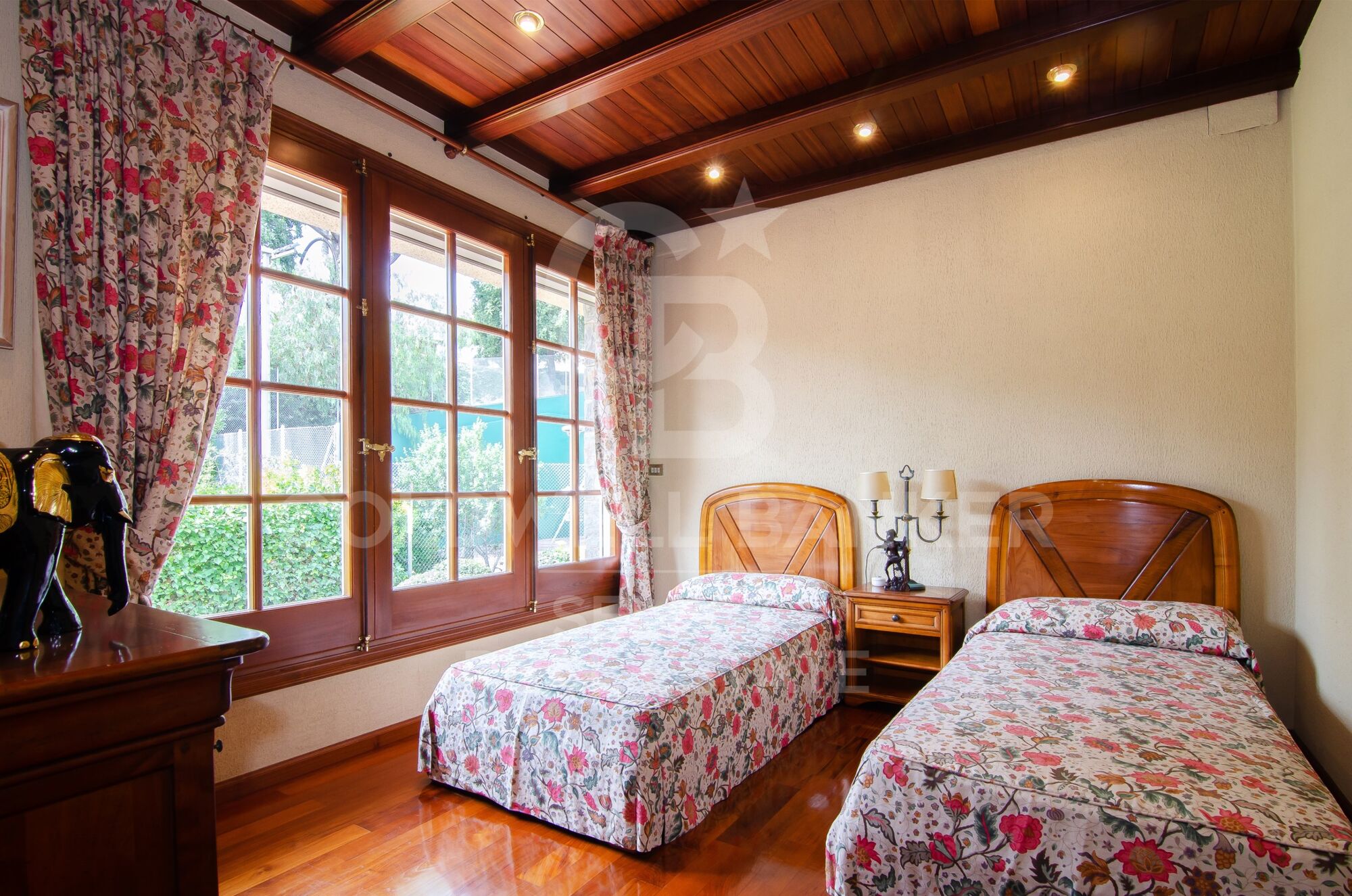 La casa fue íntegramente reformada en el año 1992, ampliándola y dándole la forma, estilo y prestaciones actuales. Entramos por el vestíbulo dónde se sitúa una elegante escalera de madera con forma curva. Nos da acceso a la planta principal, toda ella con suelo de madera natural, donde encontramos un impresionante salón comedor con chimenea y grandes ventanas, desde donde dominas la extensión completa de la propiedad. Dispone de salida inmediata al jardín que rodea toda la casa. El comedor conecta con la magnífica cocina y a su vez con la zona office y lavandería y una salida posterior con terraza deliciosa ideal para desayunos, permitIéndote disfrutar del jardín dispuesto perimetralmente. En el lado opuesto conforme subes las escaleras se sitúa la zona de noche. Cuenta con un amplio distribuidor que reparte 3 grandes habitaciones dobles una de ellas en suite y las otras dos compartiendo baño. Finalmente nos encontramos una espectacular máster suite con baño, vestidor, salón privado con chimenea y salida al jardín rematado con un delicioso porche.