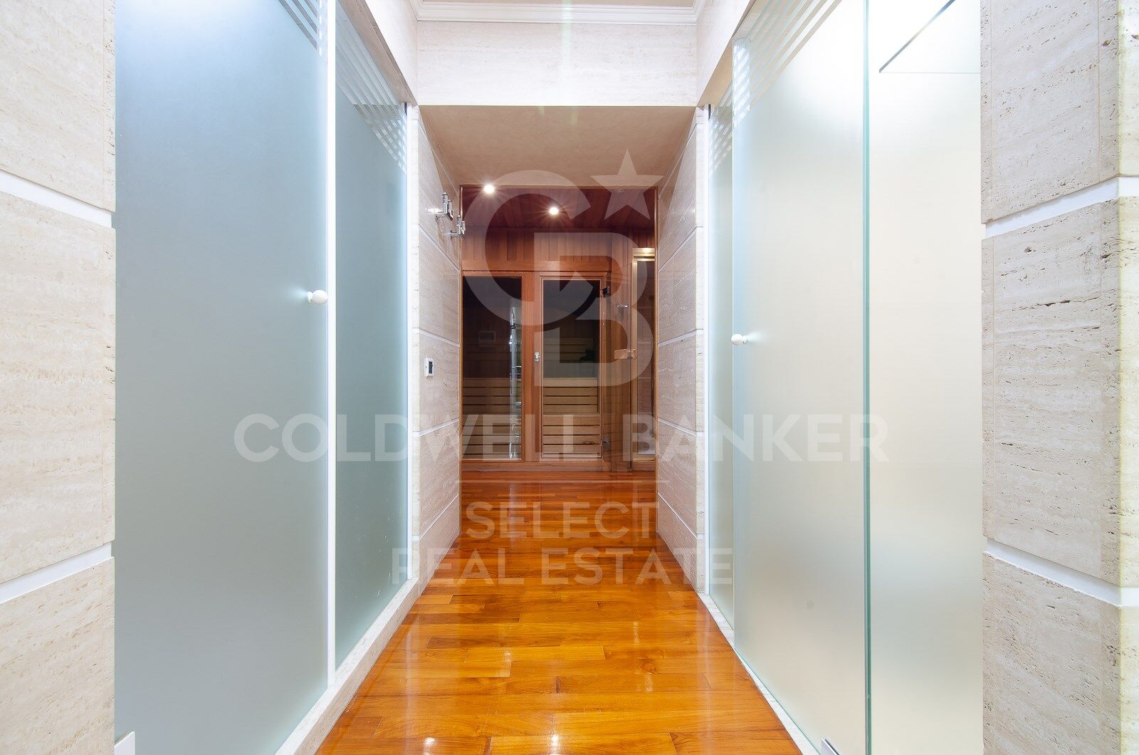 En la planta baja donde llegamos también a través de las mismas escaleras de madera, se sitúa el salón comedor de verano con apoyo de una pequeña cocina y salida directa delante de la piscina y una habitación con baño, así como un impresionante gimnasio, sauna y zona de masajes y un garaje para 3 coches grandes. El suelo en esta planta es de cerámica y dibuja formas geométricas con incrustaciones de madera.