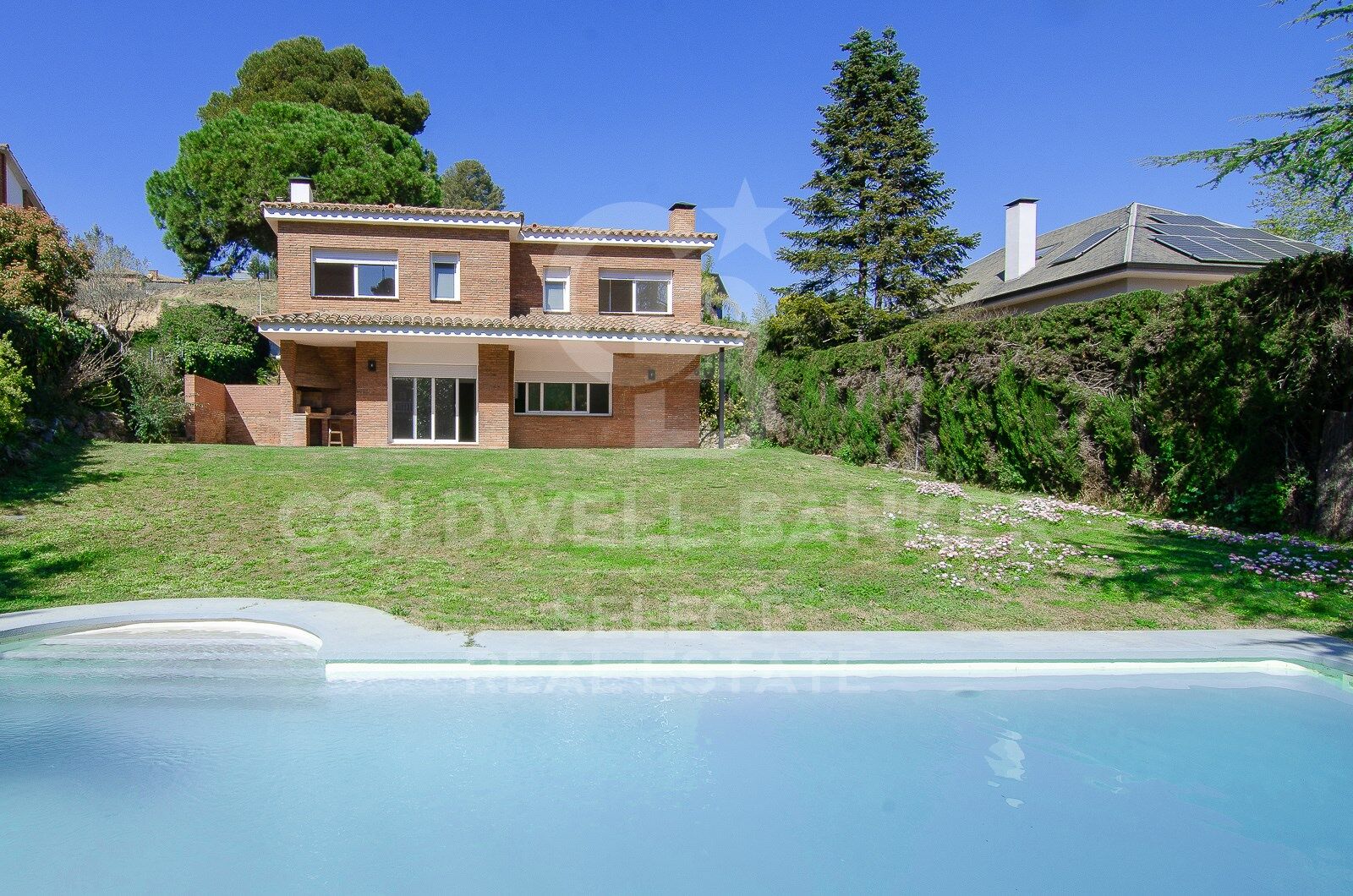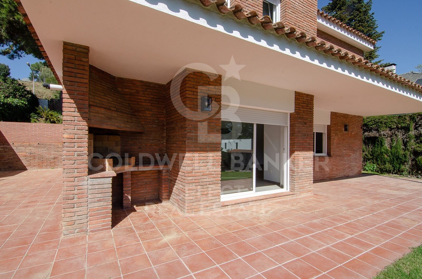 En la planta inferior, a pie de jardín y piscina, tenemos el maravilloso salón comedor con chimenea, muy luminoso a través de un gran ventanal y unas puertas correderas que nos permite acceder directamente al jardín. La visión del manto de césped verde que llega hasta la piscina es muy refrescante y nos invita a salir al jardín. Allí mismo disponemos de una gran terraza cubierta donde podremos disfrutar de comidas y cenas al fresco sin perder de vista la enorme piscina. Hay espacio suficiente dónde acomodar una zona chill out para descansar y disfrutar de conversaciones familiares y con amigos. Por último disponemos de una preciosa barbacoa muy bien integrada a la construcción. Conectado con el salón y con entrada directa a éste encontramos la cocina, funcional y espaciosa, con capacidad para acoger la zona office para desayunos. Desde la cocina accedemos a la zona de aguas y caldera que dispone salida a la parte exterior oeste de la casa. En la misma planta se halla una habitación que puede hacer la función de despacho o bien de dormitorio, asistida por un baño con ducha.