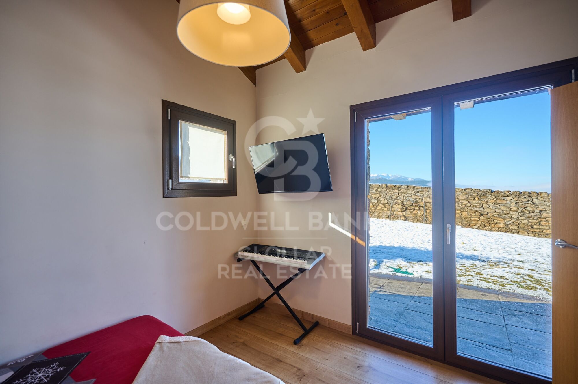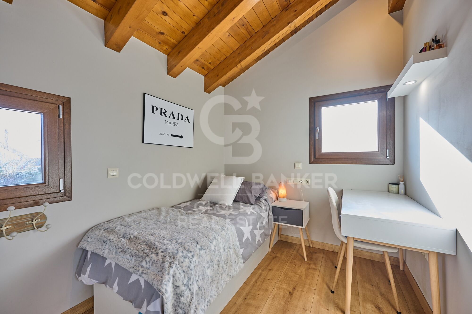 En la planta principal, un espacioso recibidor da paso a la zona de día, donde encontramos un luminoso salón con techos altos de madera y chimenea, que aporta un ambiente cálido y acogedor. El comedor, a doble altura, se integra con una cocina abierta equipada con barra pasa-platos, creando un espacio práctico y social. Desde aquí se accede directamente a la terraza y al jardín. Esta planta también dispone de zona de lavadero, una habitación doble y un baño completo. La planta superior alberga la zona de noche, caracterizada por sus techos altos que aportan amplitud y personalidad. Dispone de tres habitaciones dobles, una de ellas en formato master suite con salida a un balcón desde el que se disfrutan excelentes vistas. Las otras dos habitaciones comparten un baño completo. En la planta inferior encontramos una amplia sala con gimnasio y sauna, un espacio con múltiples posibilidades, trastero y garaje con capacidad para dos coches.