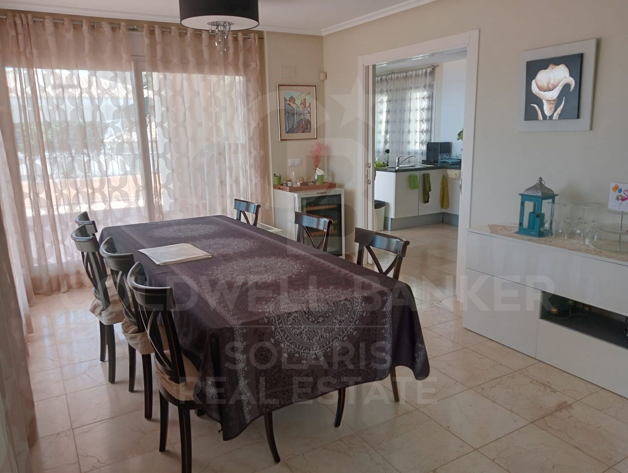 El comedor, conectado con una cocina totalmente equipada, ofrece acceso directo a otra terraza con zona de barbacoa y espacio semicubierto para disfrutar durante todo el año.