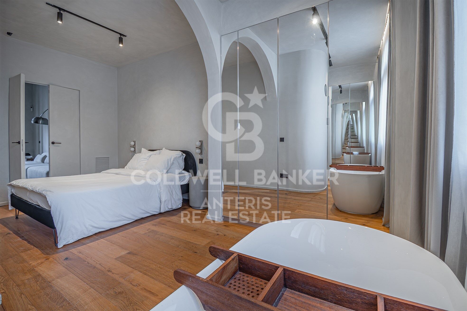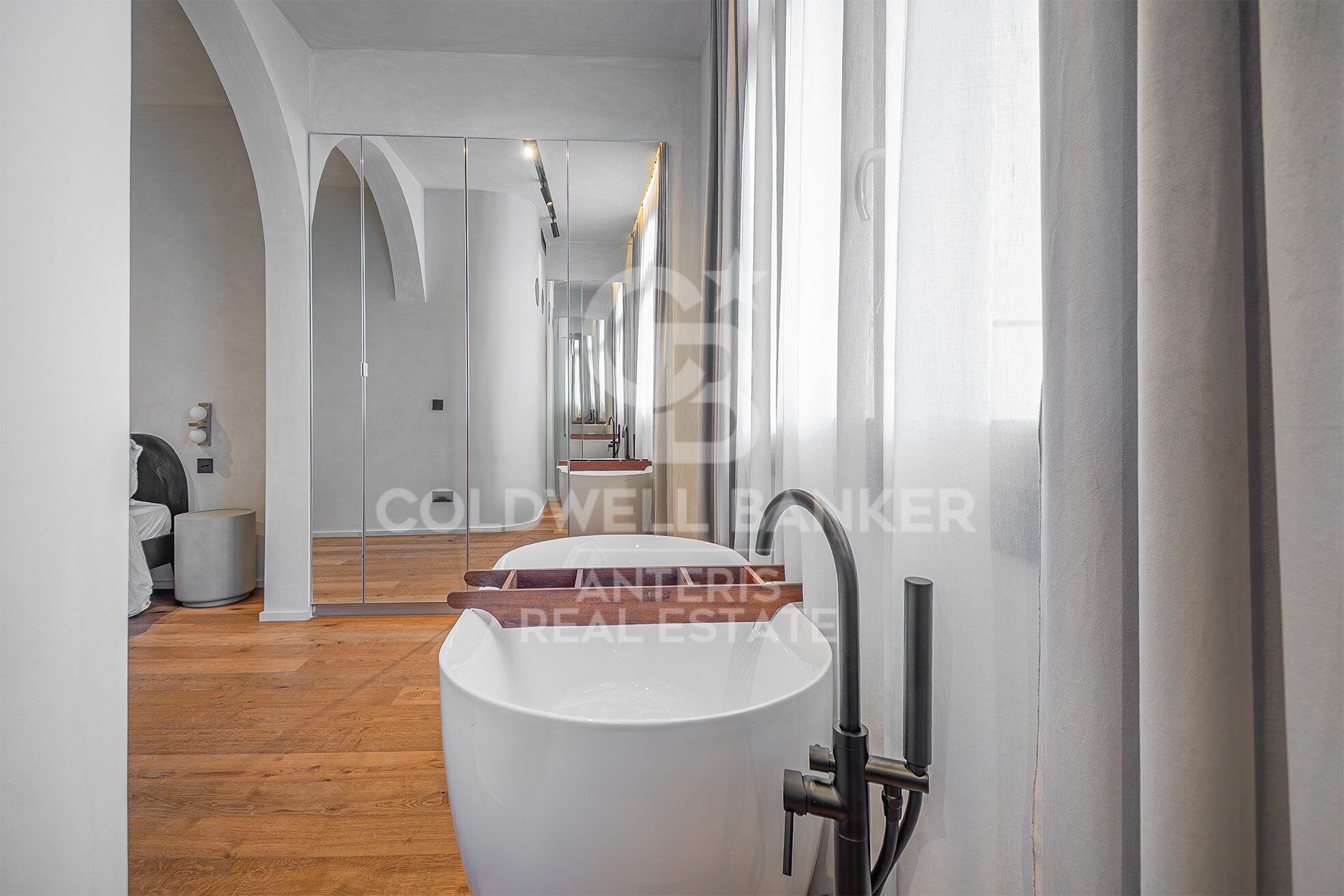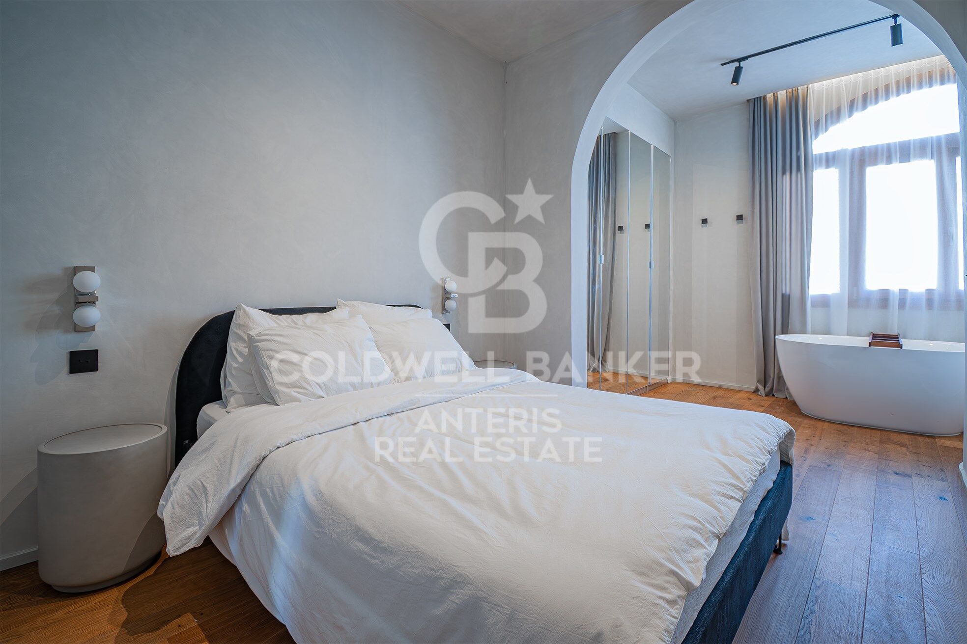 The sleeping area has a double bedroom with a large dressing room and an elegant exposed bathtub next to a large window overlooking a quiet courtyard. The full bathroom, clad in microcement, adds a contemporary and sophisticated touch.