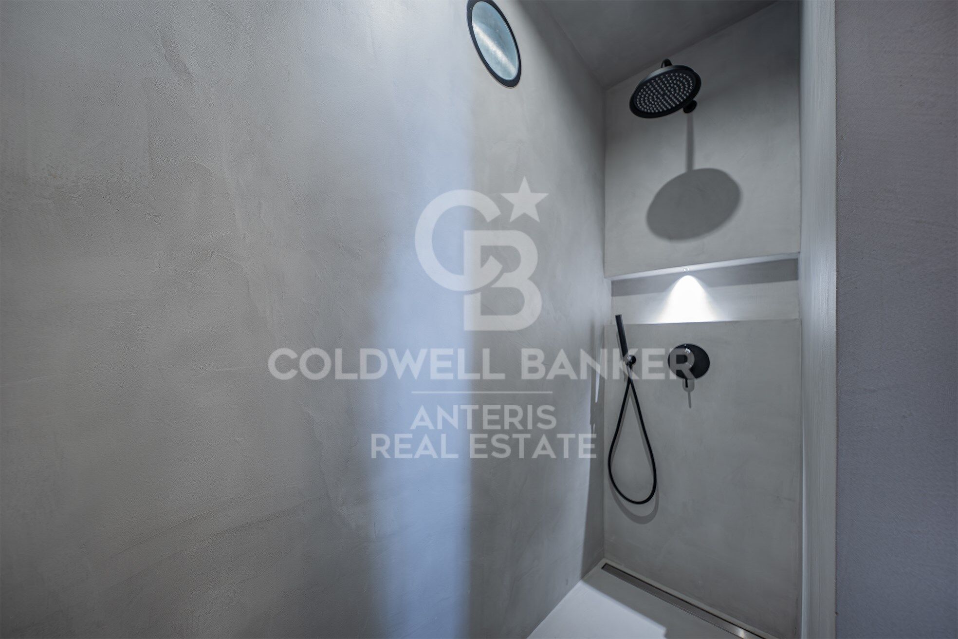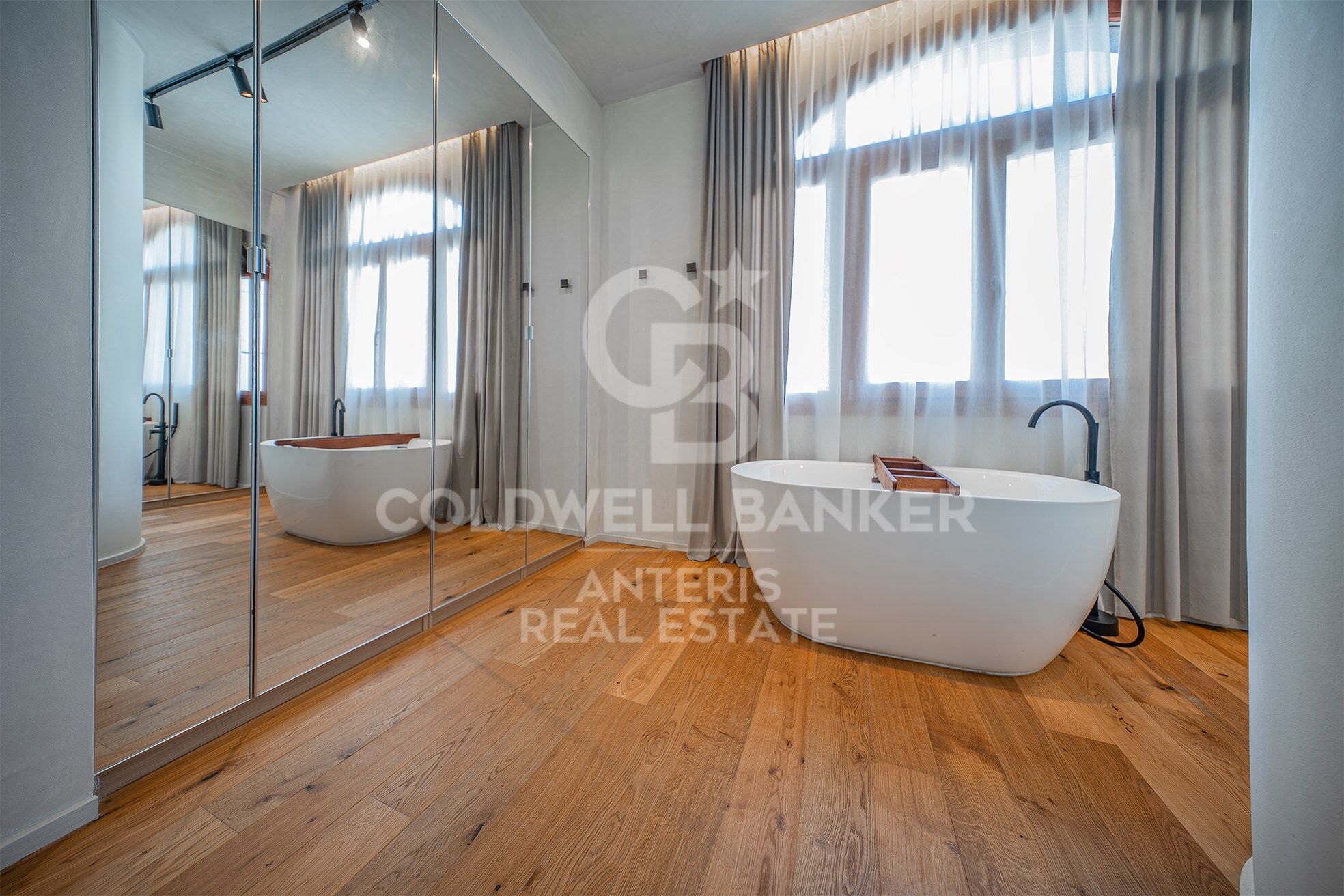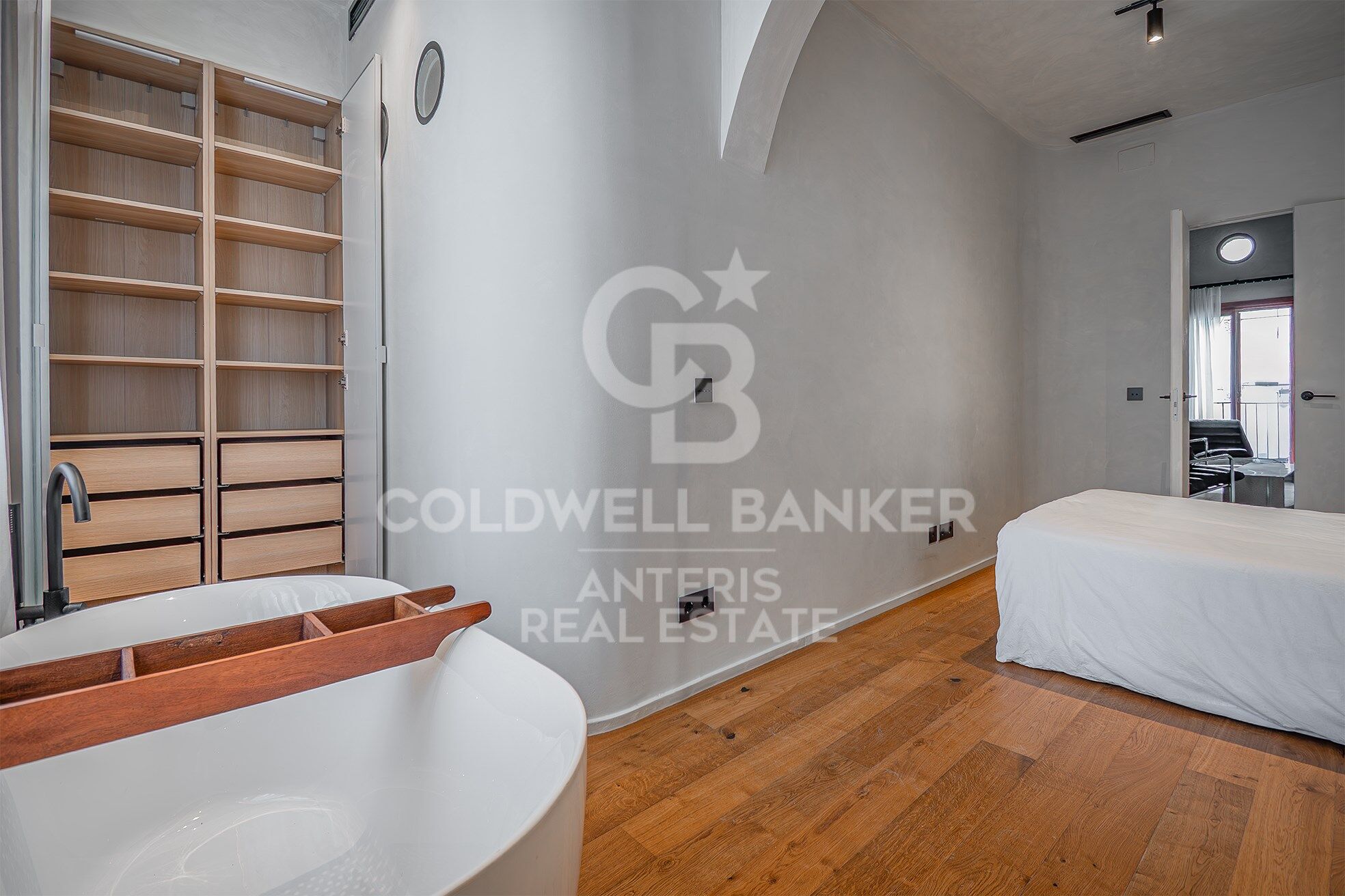 The sleeping area has a double bedroom with a large dressing room and an elegant exposed bathtub next to a large window overlooking a quiet courtyard. The full bathroom, clad in microcement, adds a contemporary and sophisticated touch.