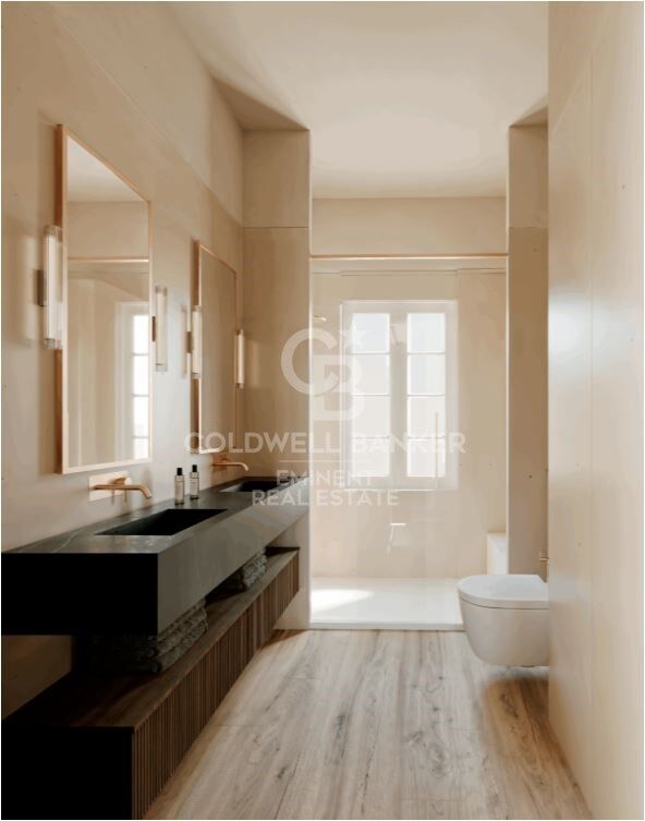 Die Wohnung verfügt über drei voll ausgestattete Badezimmer, eines davon en suite, sowie eine halb-integrierte Küche im Wohn-Essbereich, mit Zugang zu zwei typischen französischen Balkonen des Eixample.