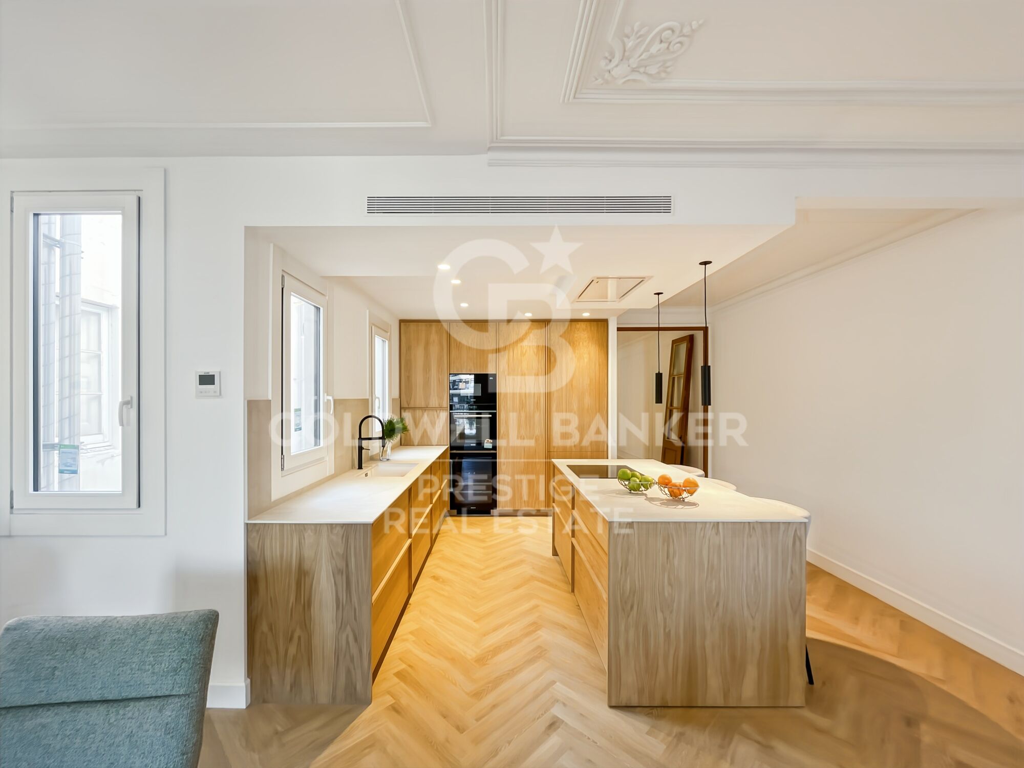 Der Schlafbereich verfügt über drei Doppelzimmer, alle mit Einbauschränken und einer effizienten Raumaufteilung. Die Master-Suite zeichnet sich durch ihre Helligkeit und Privatsphäre aus und verfügt über einen eleganten begehbaren Kleiderschrank und ein Design-Bad en suite. Die Wohnung verfügt außerdem über ein zweites komplettes Badezimmer und eine Gästetoilette.