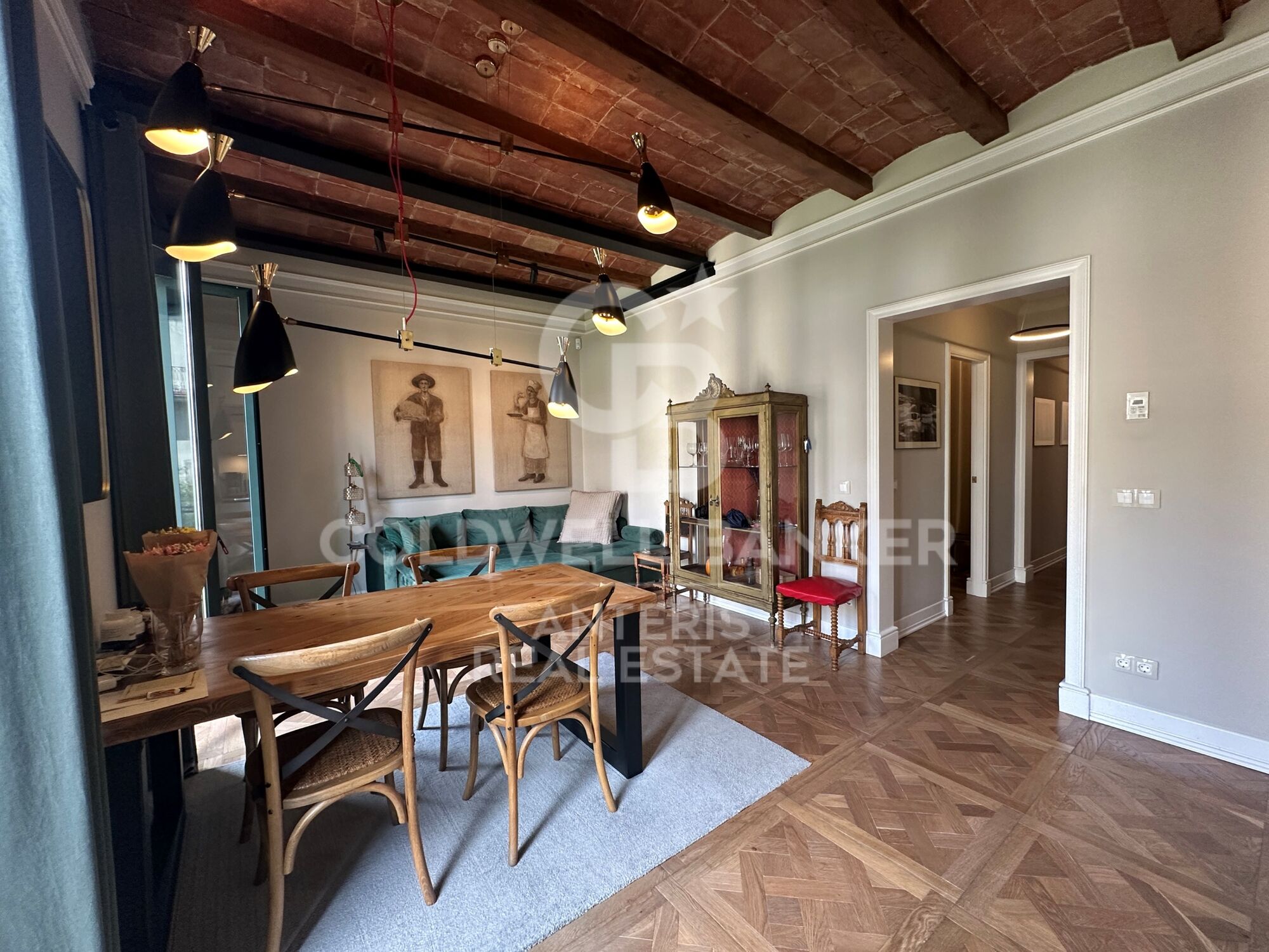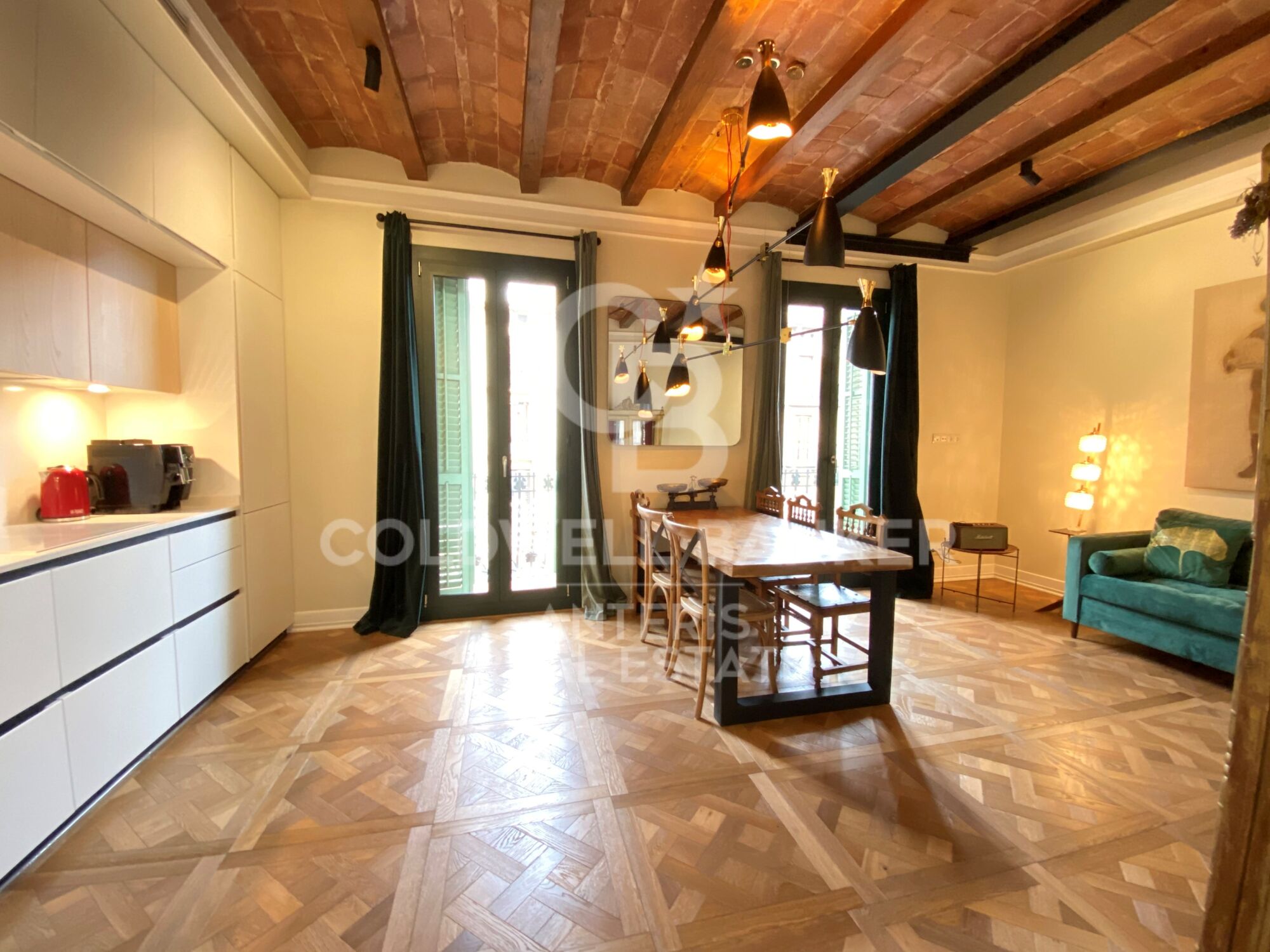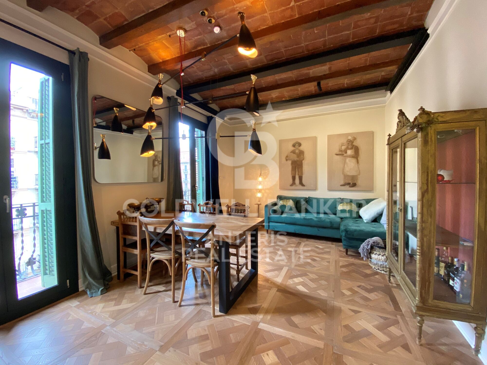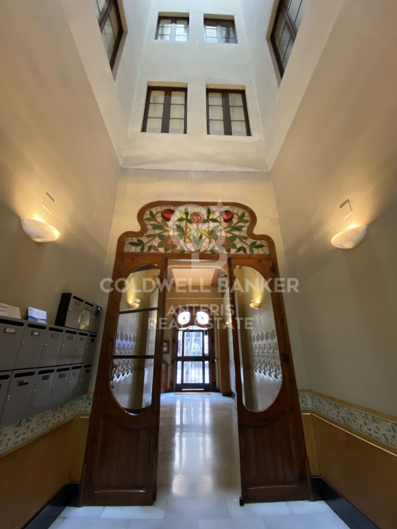 Situated on the fifth exterior floor of a beautifully preserved modernist building dating from 1920, the property is surrounded by all essential services, shops, and excellent public transport connections in central Barcelona.