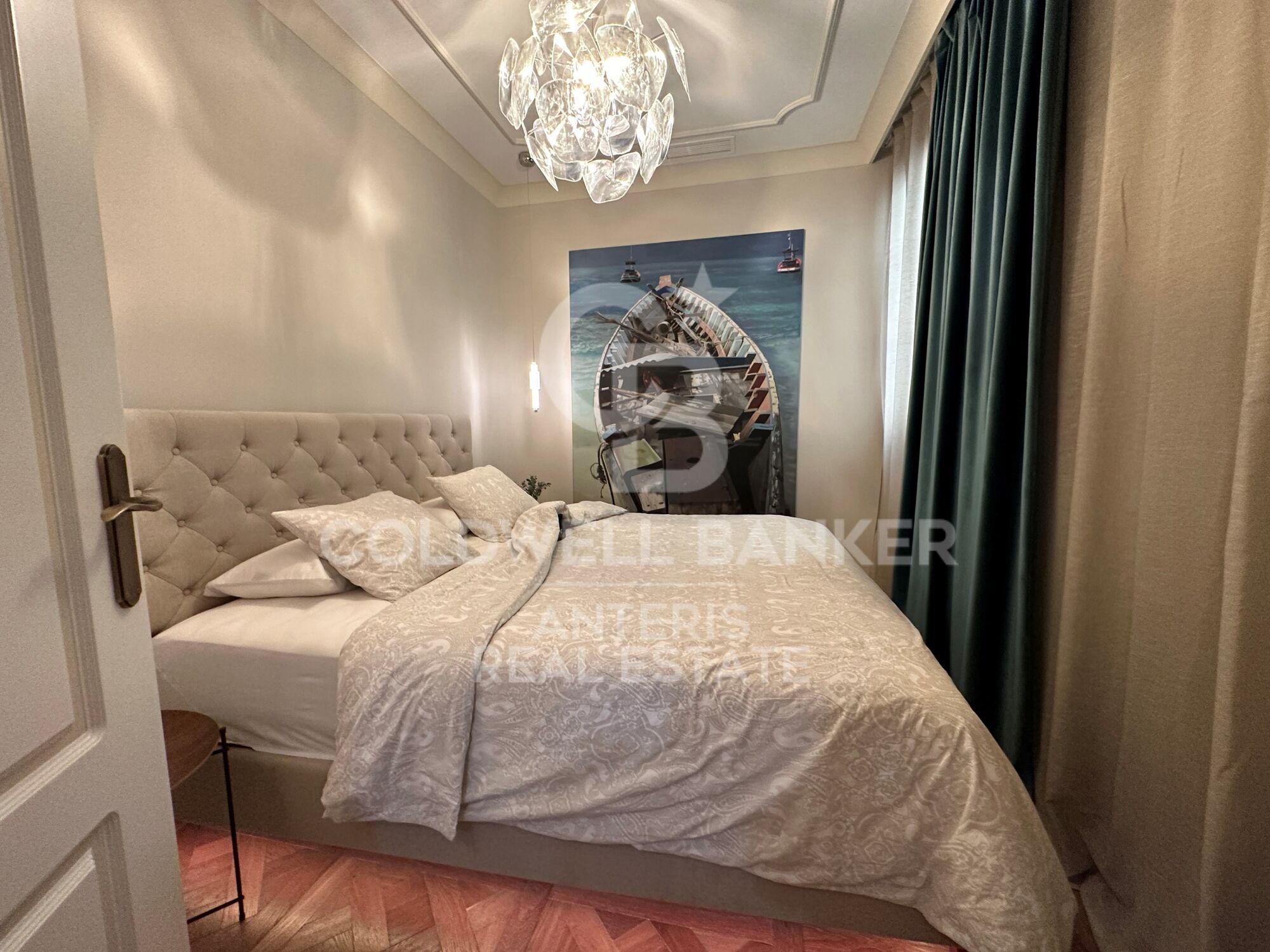 The apartment features two bedroomsone double and one medium-sizedtwo full bathrooms, and a bright living-dining area with an open-plan kitchen and access to two balconies overlooking the street. The high-quality renovation includes natural wood parquet flooring, high ceilings, ducted hot-and-cold air conditioning, aluminum windows with triple glazing, and fully equipped kitchen. A standout feature is the spacious walk-in wardrobe, a highly valued addition.