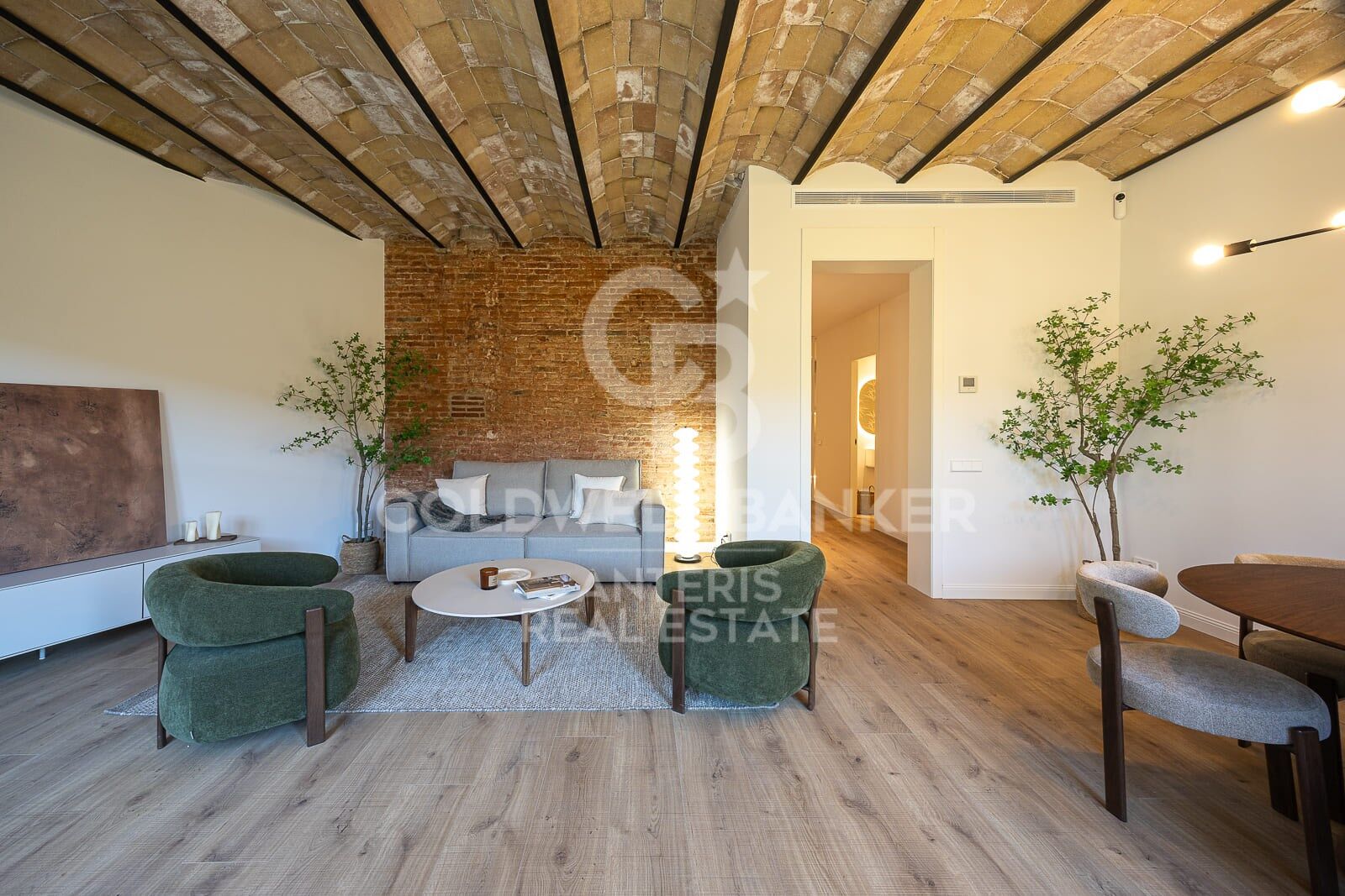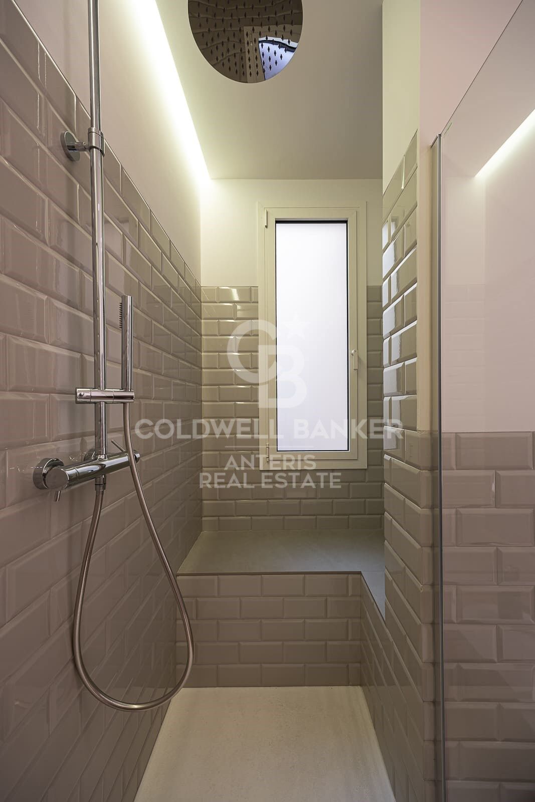 The property offers a spacious and functional design, with two double bedrooms with en-suite bathrooms: one with access to a charming gallery and the other with access to a balcony. It also has a guest restroom. The kitchen, equipped with metal and glass doors, includes Siemens appliances and connects seamlessly to the living area. The spacious and cozy living-dining room stands out for its Catalan vaulted ceiling and access to two balconies. It also has a separate laundry area for added convenience. The apartment is delivered furnished.
