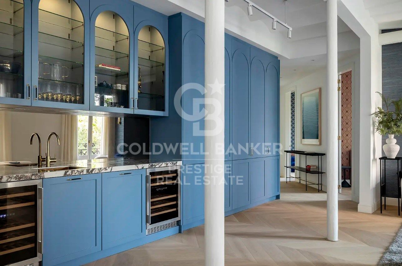 Die komplett renovierte Wohnung bietet eine fließende und moderne Raumaufteilung: Eine offene Küche und ein Esszimmer, die sich harmonisch in den Wohnbereich einfügen, ausgestattet mit einer eleganten Bar/Speisekammer mit Weinkühlschränken und Doppelgeschirrspüler, ideal für diejenigen, die gerne Gäste empfangen.