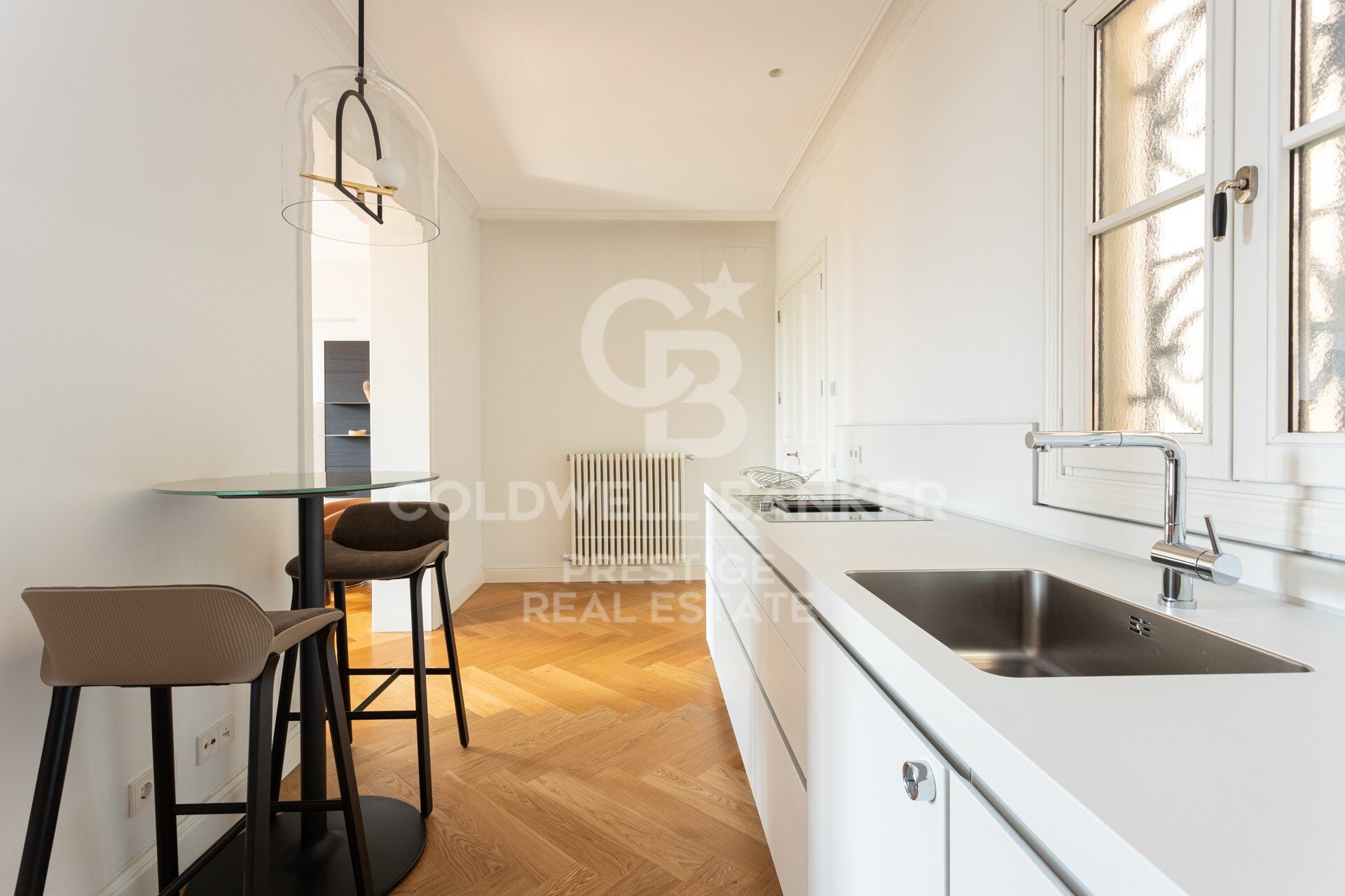Der großzügige Wohnbereich ist offen gestaltet und wird dank großer Fenster mit freiem Blick auf eine der emblematischsten Avenidas Barcelonas in natürliches Licht getaucht.