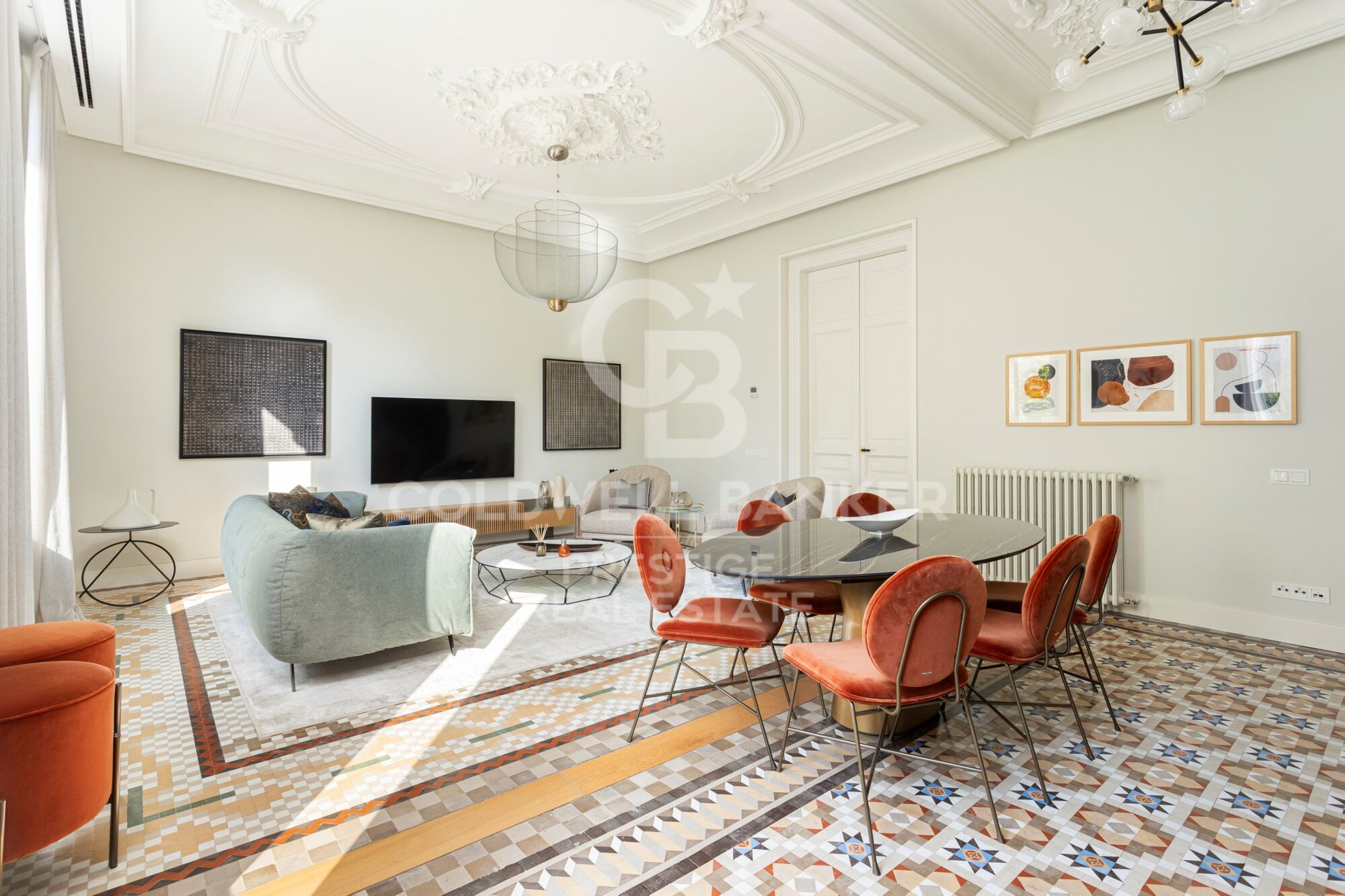 Dieses spektakuläre Apartment mit 165 m² verbindet historischen Glanz mit zeitgenössischem Interior-Design des internationalen Studios HJ Design Studio, das die wertvollen modernistischen Elemente mit Designerstücken von Bonaldo, Bontempi, Christian Lacroix, Roche Bobois, Mooi, Vibia, Foscarini und vielen weiteren meisterhaft hervorgehoben hat.