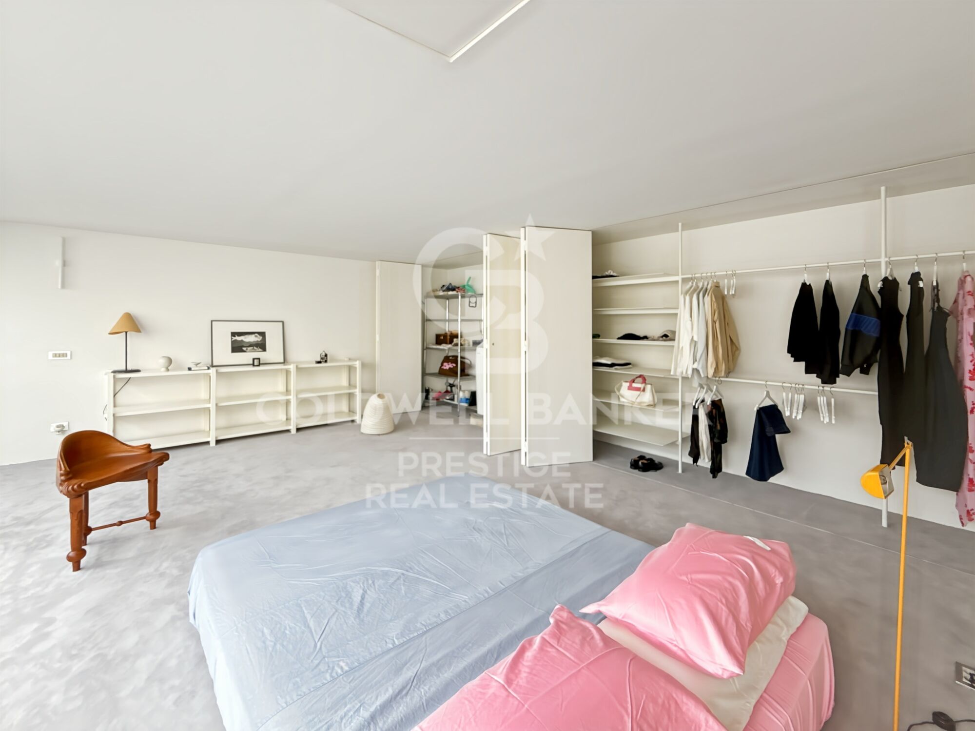Das doppelstöckige Volumen ist um ein großes, zum Meer ausgerichtetes Oberlicht organisiert, das den Innenraum mit natürlichem Licht durchflutet. Das Erdgeschoss beherbergt eine voll ausgestattete Küche und ein Badezimmer aus Marmor mit Spiegeldusche. Die obere Etage, 25 m² groß, bietet Einbauschränke und Stauraum. Eine elegante Wendeltreppe aus Stahl verbindet beide Ebenen und schafft eine anspruchsvolle, zeitgenössische Atmosphäre. Zu den Ausstattungen gehören ein grauer Wollteppichboden, ein maßgefertigtes Sofa und ein integriertes Klimasystem.